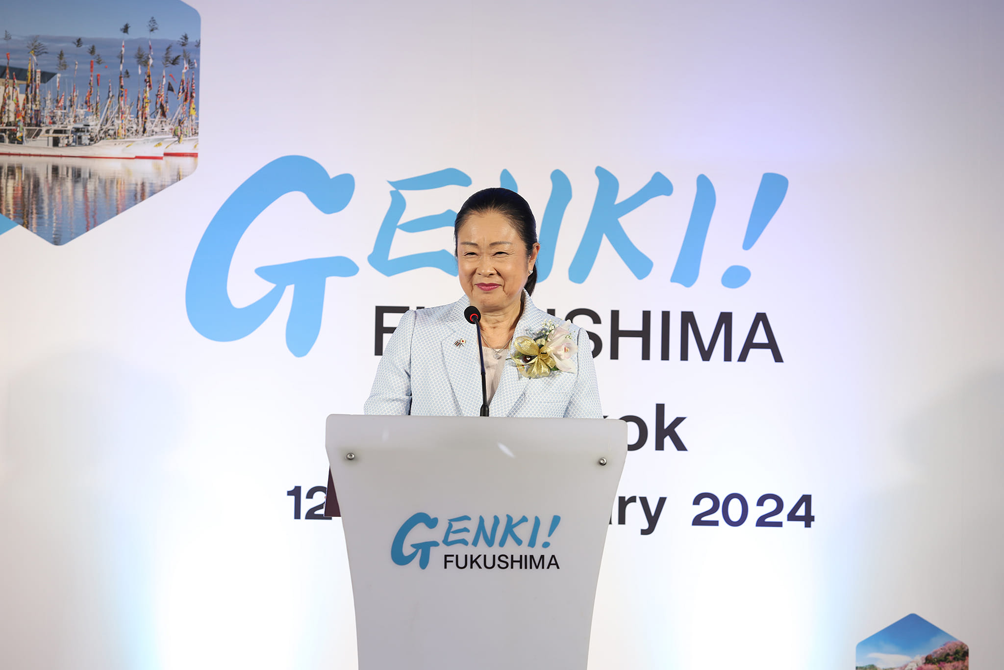 คุณซึจิยะ ชินาโกะ รัฐมนตรีกระทรวงฟื้นฟู ประเทศญี่ปุ่น กล่าวว่า เหตุแผ่นดินไหวครั้งใหญ่ทางฝั่งตะวันออกของประเทศญี่ปุ่นเมื่อปี 2011 ส่งผลให้จังหวัดฟุกุชิมะได้รับความเสียหายจากแผ่นดินไหวและคลื่นสึนามิ โดยหลังจากที่เกิดแผ่นดินไหวก็ได้รับความช่วยเหลือจากทุกท่านในต่างแดน รวมถึงประเทศไทยด้วย ปัจจุบันนี้จังหวัดฟุกุชุมิกำลังฟื้นฟูได้อย่างมั่นคง ทำให้ดิฉันรู้สึกขอบคุณคนไทยมาตลอด การจัดงาน GENKI! FUKUSHIMA 2024 จึงมีวัตถุประสงค์เพื่อแนะนำให้ชาวไทยทุกท่าน ได้รู้จักเสน่ห์ของอาหารการกินและการท่องเที่ยวของจังหวัดฟุกุชิมะที่ได้ผ่านการฟื้นฟูหลังเกิดเหตุแผ่นดินไหว เริ่มจากอาหารทะเล ปลาที่จับได้ตามชายฝั่งทะเลของจังหวัดฟุกุชิมะมีคุณภาพดีเลิศ คนในประเทศญี่ปุ่นเองก็ชื่นชอบกันมาก