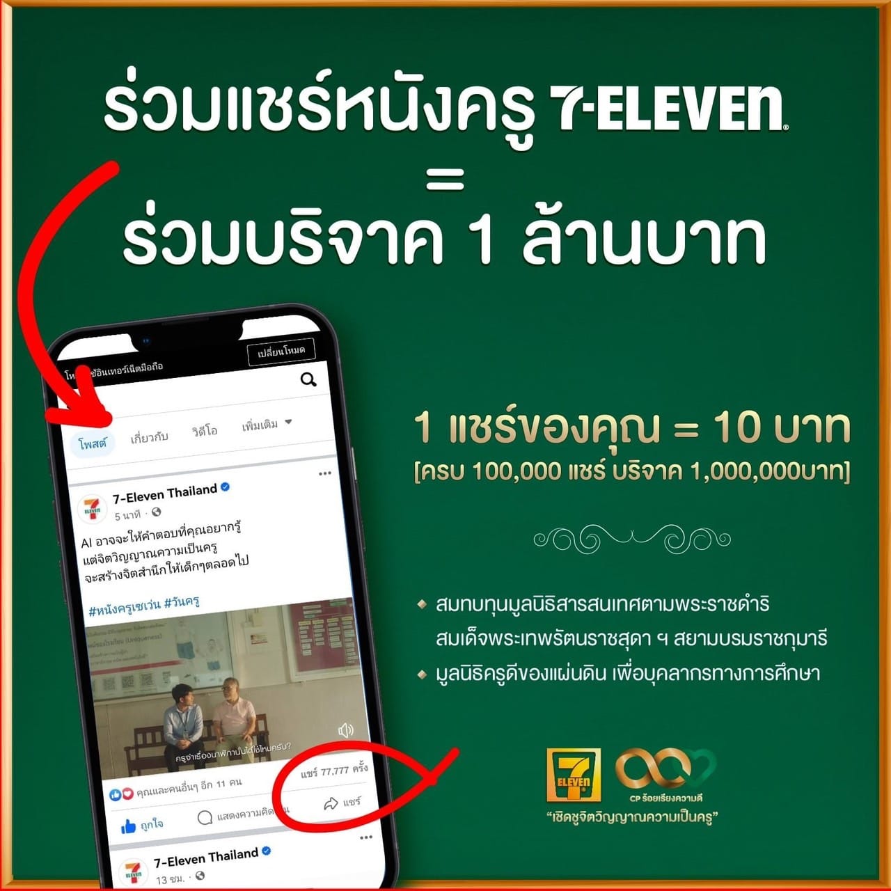 นอกจากนี้ ซีพี ออลล์ และ เซเว่น อีเลฟเว่น ขอเชิญชวนคนไทยทุกคนรับชมภาพยนตร์ "เชิดชูจิตวิญญาณความเป็นครู" ผ่านทางเฟซบุ๊ก 7-Eleven Thailand พร้อมเชิญร่วมแชร์ภาพยนตร์ โดย 1 แชร์ มีค่าเท่ากับ 10 บาท ครบ 100,000 แชร์ ซีพี ออลล์ และ เซเว่น อีเลฟเว่น มอบ 1 ล้านบาท ให้กับมูลนิธิเทคโนโลยีสารสนเทศตามพระราชดำริสมเด็จพระเทพรัตนราชสุดาฯ สยามบรมราชกุมารี และ มูลนิธิครูดีของแผ่นดิน เพื่อนำไปสนับสนุนภารกิจของทางมูลนิธิฯ ตามปณิธาน "Giving & Sharing" ของซีพี ออลล์ ต่อไป