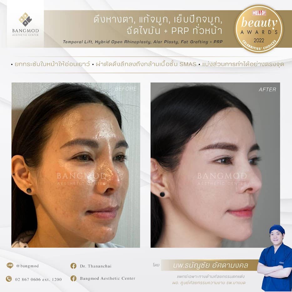 ส่วนการเสริมจมูก เรามีเทคนิคใหม่เรียกว่า Bangmod Nose เป็นการผ่าตัดด้วยเทคนิค Hybrid Open Rhinoplasty เทคนิคเฉพาะของศูนย์ศัลยกรรมความงามโรงพยาบาลบางมด แพทย์จะใช้ซิลิโคนแบบนิ่มพิเศษตกแต่งแบบเคสต่อเคสเพื่อเสริมบริเวณสันจมูก จากนั้นจะใช้กระดูกอ่อนจากส่วนอื่นของร่างกายเพื่อนำมารองปลายจมูก โดยกระดูกอ่อนที่นิยมนำมาใช้ ได้แก่ กระดูกอ่อนหลังหู กระดูกอ่อนแกนจมูก และกระดูกอ่อนซี่โครง ทั้งนี้การรองปลายจมูกด้วยกระดูกอ่อนจะสามารถยืดปลายจมูกได้มากกว่าและลดโอกาสซิลิโคนทะลุ โดยตกแต่งปลายจมูกด้วยเทคนิคการเย็บ Interdomal Suture ทั้งหมดนี้ใช้การเปิดแผลผ่าตัดด้วยเทคนิค Open Rhinoplasty ซึ่งจะทำให้แพทย์สามารถเห็นโครงสร้างของจมูกชัดเจน ทำให้สามารถแก้ไขโครงสร้างภายในจมูกที่มีปัญหาได้อย่างตรงจุด