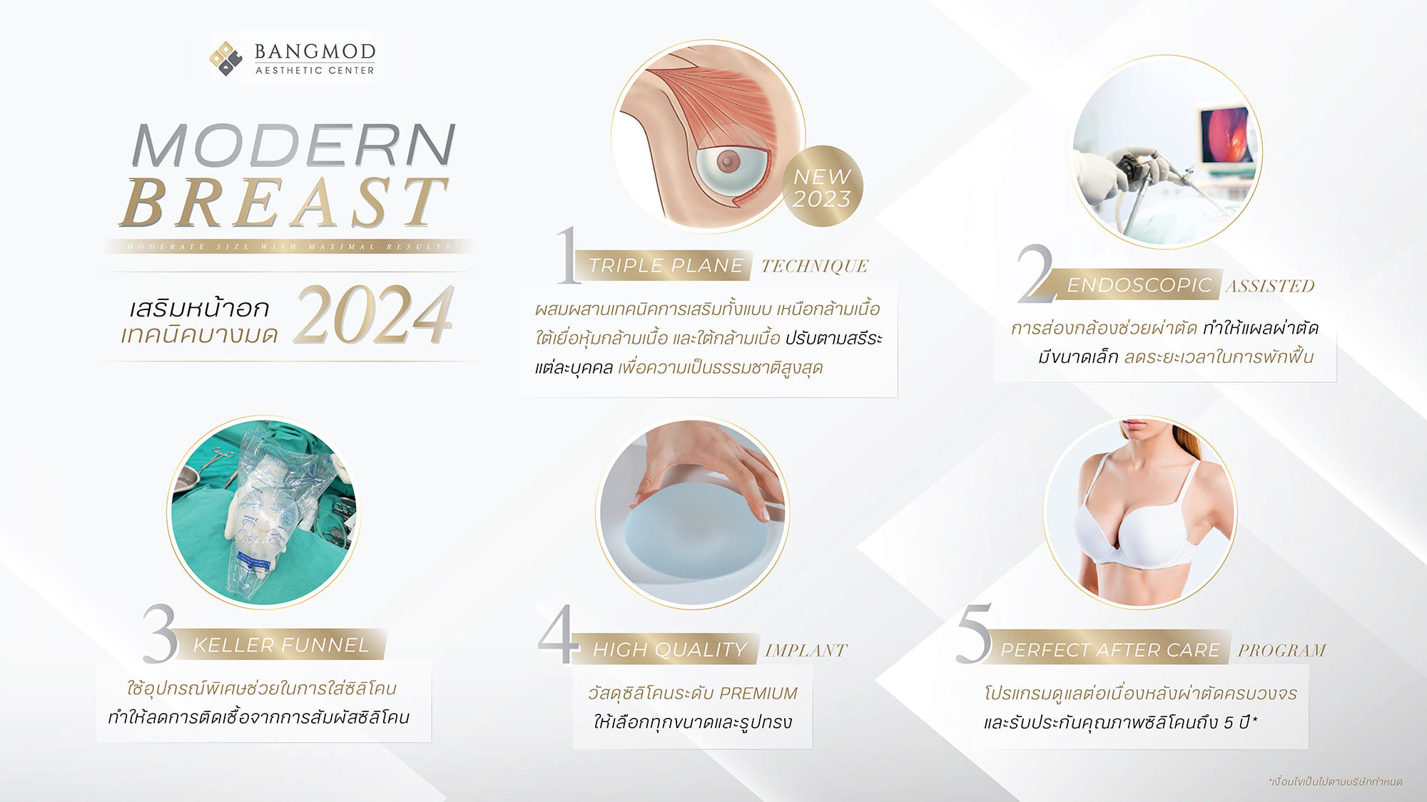 ขณะที่เรื่องการเสริมหน้าอก ทางศูนย์ศัลยกรรมความงามโรงพยาบาลบางมดได้เปิดตัวเทคนิคการเสริมหน้าอก Modern Breast 2024 โดยจะเป็นการผ่าตัดด้วยเทคนิค Triple Plane ผสมผสานเทคนิคการเสริมถุงซิลิโคน ทั้งแบบ เหนือกล้ามเนื้อ (Subglandular plane) ใต้เยื่อหุ้มกล้ามเนื้อ (Subfascial plane) และ ใต้กล้ามเนื้อ (Subpectoral plane) เพื่อความเป็นธรรมชาติและปรับระดับตามสรีระหน้าอกของแต่ละบุคคล ด้วยเทคนิคพิเศษ Endoscopic Assisted Breast Augmentation ใช้การส่องกล้องช่วยในการผ่าตัด เพื่อให้แผลเล็ก เจ็บน้อย และหายเร็ว ที่สำคัญสามารถเลือกแผลผ่าตัดได้ ไม่ว่าจะเป็นแผลใต้ราวนม หรือ แผลใต้รักแร้
