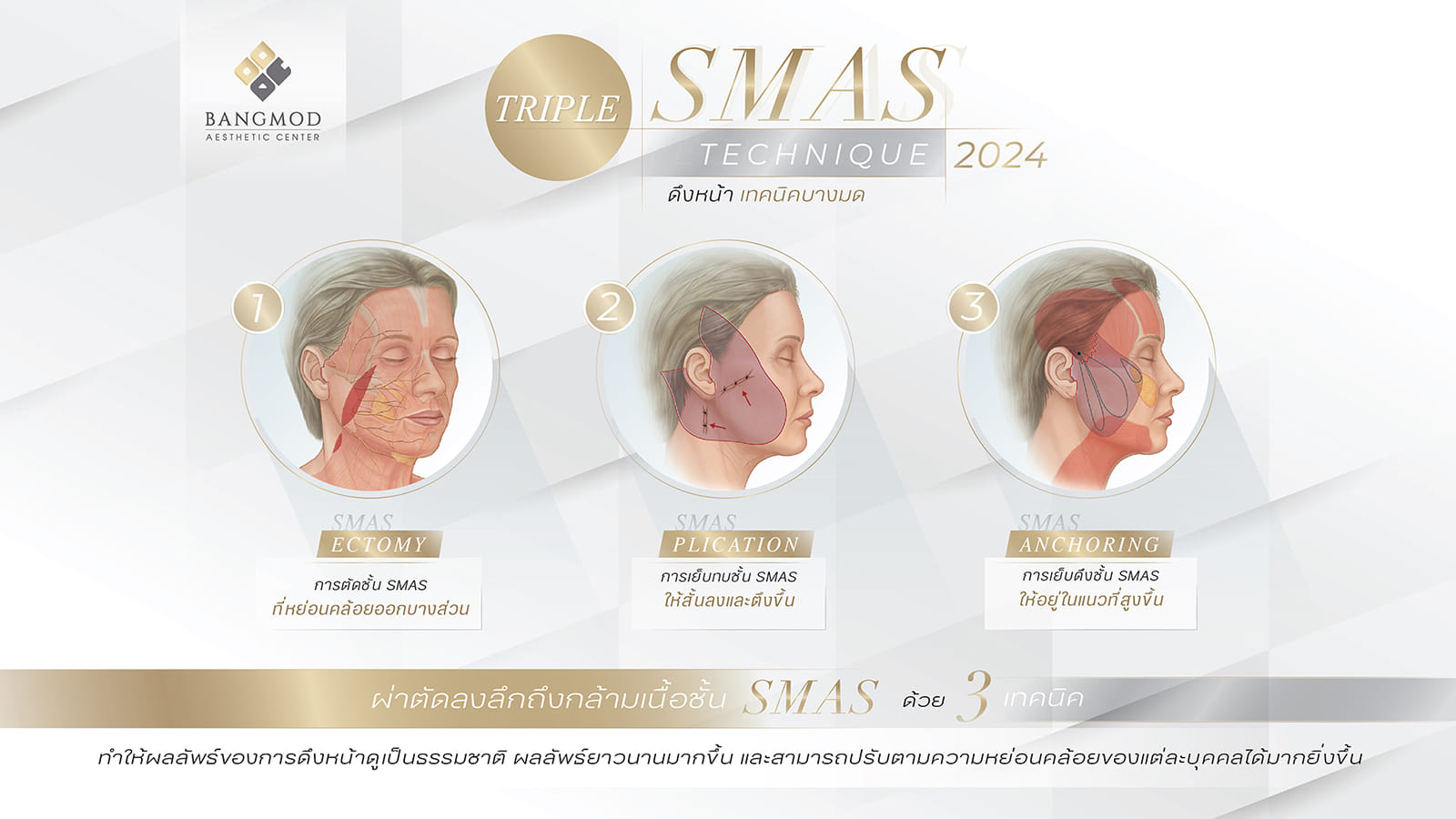 การดึงหน้า Modern Facelift 2024 จะเป็นการผ่าตัดด้วยเทคนิค Triple SMAS Lock ประกอบด้วย SMAS plication, SMASectomy และ SMAS anchoring เป็นการเย็บล็อกที่ชั้นกล้ามเนื้อ (SMAS) ช่วยเพิ่มความแข็งแรงในชั้น SMAS ได้ถึง 3 เท่าของเทคนิคการผ่าตัดทั่วไป และสามารถแก้ไขความหย่อนคล้อย ของใบหน้าและลำคอได้ทั้งหมด ให้ผลลัพธ์อยู่ได้คงทนมากขึ้น สามารถปรับตามโครงสร้างร่างกายและปรับตามความหย่อนคล้อยของแต่ละบุคคลได้มากยิ่งขึ้น สามารถฉีดไขมันของตัวเอง (Fat Grafting) และ ผสานสารสกัดพลาสม่า (PRP) ทั่วใบหน้า ด้วยเทคนิคบางมด ร่วมกับการผ่าตัดดึงหน้า จะช่วยเติมเต็มร่อง และริ้วรอยต่างๆ ให้ตื้นลง และทำให้คุณภาพของผิวดีขึ้น อีกทั้งยังสามารถแบ่งดึงหน้าได้เป็น 4 ส่วน ดังนี้ หน้าผาก ใบหน้าส่วนบน ใบหน้าส่วนกลางรวมถึงส่วนล่าง และลำคอ และสามารถผ่าตัดแยกส่วนได้ ทำให้ผ่าตัดได้ตรงปัญหามากยิ่งขึ้น
