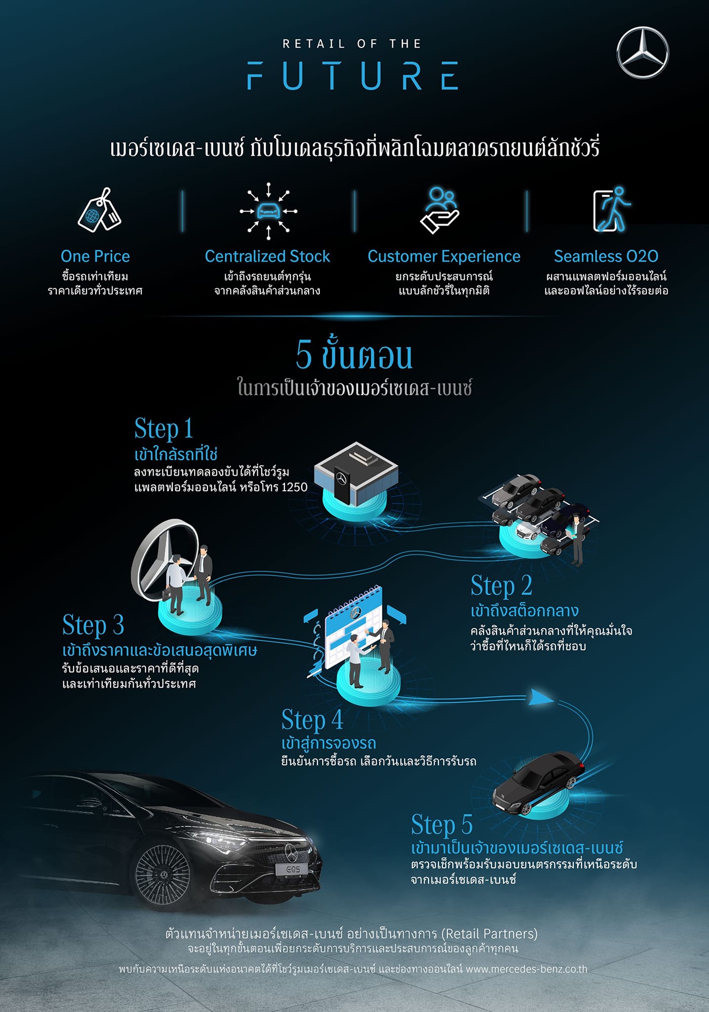เมอร์เซเดส-เบนซ์ ประเทศไทย มีความมุ่งมั่นในการส่งมอบรถยนต์ที่มีความหรูหราและเป็นที่ต้องการ ควบคู่ไปกับการนำเสนอประสบการณ์ที่เหนือระดับในทุกมิติให้กับลูกค้าทุกคน โมเดลธุรกิจ Retail of the Future ถือเป็นเครื่องพิสูจน์ให้เห็นถึงจิตวิญญาณแห่งนวัตกรรมของเมอร์เซเดส-เบนซ์ ที่สะท้อนผ่านทุกก้าวสำคัญในการออกแบบการเดินทางที่น่าตื่นเต้นและน่าประทับใจให้กับผู้ที่เป็นเจ้าของ เมอร์เซเดส-เบนซ์ ทุกคน