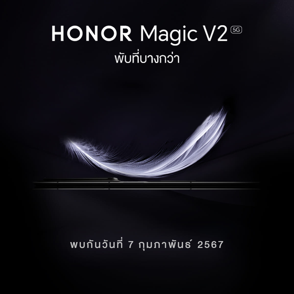 ห้ามพลาด! เตรียมสัมผัสกับความมหัศจรรย์แห่งความบางและเบาที่สุด ครั้งแรกในประเทศไทย ในงานแถลงข่าวเปิดตัวสมาร์ตโฟนจอพับรุ่นใหม่ HONOR Magic V2 และโปรโมชันสุดพิเศษ พร้อมกันในวันพุธที่ 7 กุมภาพันธ์ 2567 เวลา 14.00 น. ผ่านทาง Facebook และ YouTube Live HONOR Thailand โดยจะเริ่มพรีออเดอร์พร้อมโปรโมชันพิเศษระหว่างวันที่ 8 - 12 กุมภาพันธ์ และเริ่มวางจำหน่ายสินค้าที่ร้านตัวแทนจำหน่ายทั่วประเทศ ในวันที่ 13 กุมภาพันธ์ 2567