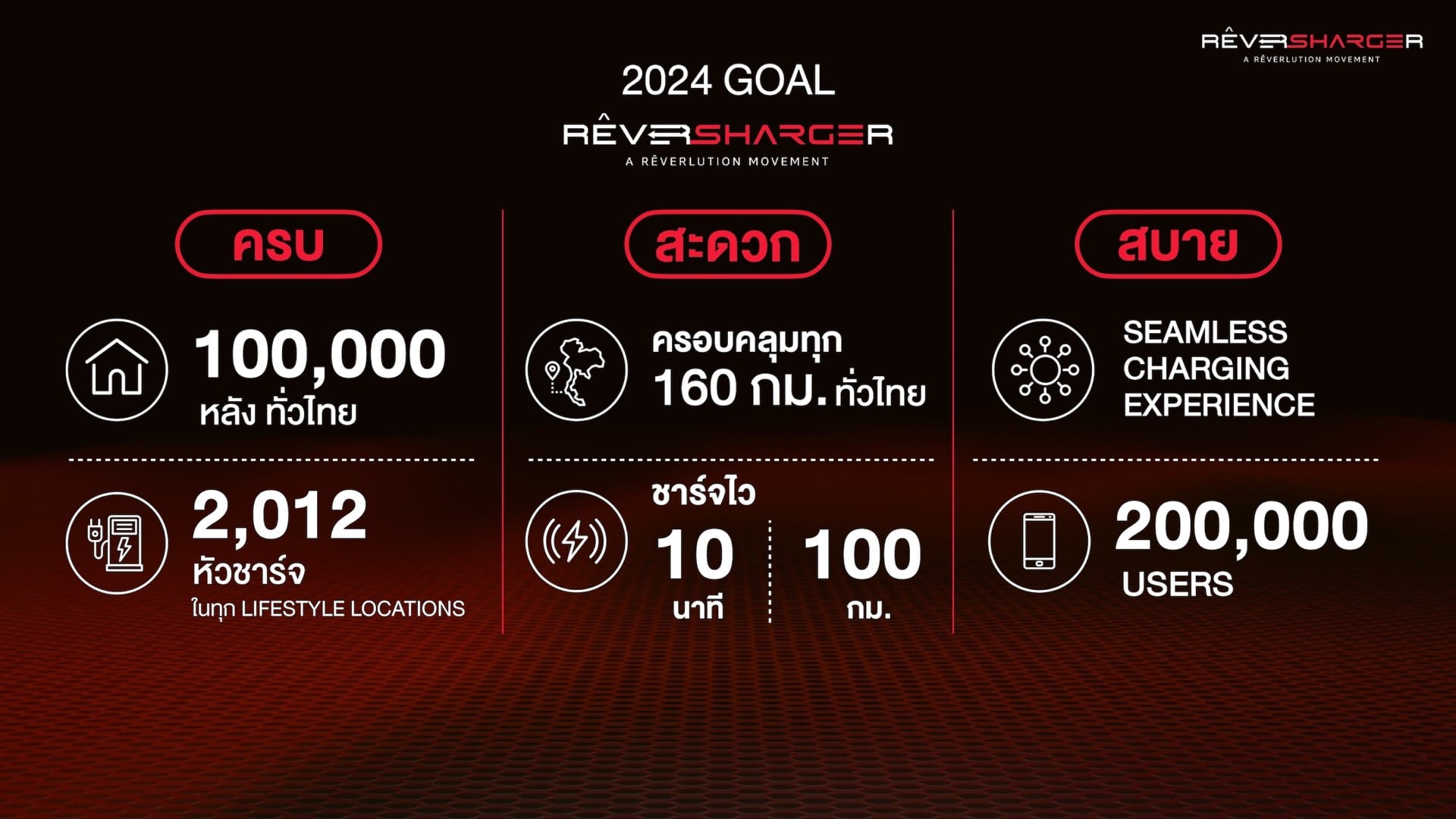 REVERSHARGER เผยวิสัยทัศน์ 2567 รับตลาด EV จ่อทะลุ 200,000 คัน ดึง Insight ผู้ใช้รถ EV สู่การยกระดับประสบการณ์ชาร์จ EV ให้ครบ-สะดวก-สบาย ตอกย้ำผู้นำอันดับ 1 EV Ecosystem Operator ครบวงจร ชู 3 หัวใจหลัก ครบจบทุกการชาร์จ ผนึกกำลังพันธมิตร บริการติดตั้งเครื่องชาร์จให้ผู้ใช้งานทั่วไทย ช่วยองค์กรใช้รถสันดาปเปลี่ยนผ่านสู่ EV สะดวกทุกเส้นทาง บริการสถานีสาธารณะเหนือ-ใต้-ออก-ตก ทุก 160 กม. พร้อมหัวชาร์จ DC ความเร็วสูง ชาร์จ 10 นาที วิ่งไกล 100 กม. สบายชาร์จง่ายทุกคัน พัฒนาฟีเจอร์ระดับโลกในแอป ให้หาจุดชาร์จง่าย-ชาร์จง่าย-ชำระเงินง่าย วางเป้าสิ้นปี 2567 ติดตั้ง EV Charger ให้บ้านสะสม 100,000 หลัง มีหัวชาร์จสาธารณะ 2,012 หัวชาร์จ รองรับผู้ใช้งานแอปโตทะลุ 200,000 ราย
