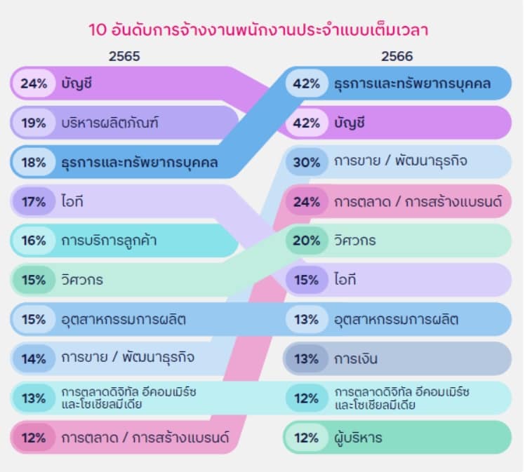 ภาพรวมการจ้างงานในปี 2566 พบว่า ตำแหน่งธุรการ/ทรัพยากรบุคคลและตำแหน่งบัญชี มาเป็นอันดับหนึ่งที่ร้อยละ 42 ถัดมาคือตำแหน่งการขาย/พัฒนาธุรกิจ ร้อยละ 42 ตำแหน่งการตลาด/การสร้างแบรนด์ ร้อยละ 24 และตำแหน่งวิศวกร ร้อยละ 20 ตามลำดับ แสดงให้เห็นถึงความสำคัญของตำแหน่งงานเหล่านี้ในธุรกิจยุคปัจจุบัน ส่วนการลดจำนวนพนักงานในภาพรวมคิดเป็นร้อยละ 19 โดยร้อยละ 13 เป็นพนักงานประจำแบบเต็มเวลาในตำแหน่งการขาย/พัฒนาธุรกิจ ตำแหน่งธุรการ/ทรัพยากรบุคคล ตำแหน่งการบริการลูกค้า ตำแหน่งบัญชีและตำแหน่งการตลาด/การสร้างแบรนด์ ส่วนพนักงานตามสัญญาจ้างหรือพนักงานชั่วคราวแบบเต็มเวลา คิดเป็นร้อยละ 7 โดยส่วนใหญ่เป็นธุรกิจขนาดเล็กและขนาดกลาง สำหรับธุรกิจขนาดใหญ่ยังคงมีอัตราการลดสูงสุด คาดว่ามาจากการปรับโครงสร้างแผนก การลดขนาดและต้องการผลประกอบการที่เพิ่มขึ้น