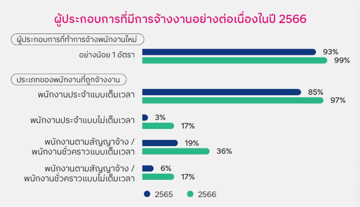 ในปี 2566 ที่ผ่านมา ร้อยละ 99 บริษัทมีการจ้างพนักงานเพิ่มขึ้นอย่างน้อย 1 คน โดยร้อยละ 97 เป็นพนักงานประจำแบบเต็มเวลา แสดงให้เห็นถึงความมุ่งมั่นในการสร้างบุคลากรที่มีความมั่นคงและทำงานในระยะยาว ลำดับถัดมาร้อยละ 36 จะเป็นพนักงานตามสัญญาจ้างหรือพนักงานชั่วคราวแบบเต็มเวลา เพื่อเพิ่มความยืดหยุ่นในการจัดตารางเวลา ต้นทุนด้านสวัสดิการ ปริมาณงาน ทักษะ ตลอดจนสร้างแรงจูงใจให้คนที่ต้องการความสมดุลระหว่างงานกับชีวิตส่วนตัว (Work life Balance) จุดที่น่าสนใจคือพนักงานตามสัญญาจ้างหรือพนักงานชั่วคราวแบบเต็มเวลา ได้รับการจ้างงานเพิ่มขึ้นจากธุรกิจทุกขนาด คิดเป็นร้อยละ 17 ในธุรกิจขนาดเล็ก ร้อยละ 22 ในธุรกิจขนาดกลางและร้อยละ 20 ในธุรกิจขนาดใหญ่ ซึ่งคาดว่ามาจากเหตุผลข้างต้น