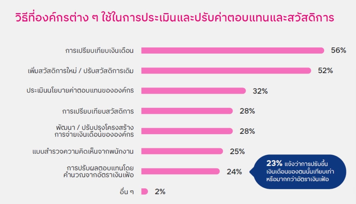 สำหรับการเพิ่มศักยภาพให้พนักงาน ค่าจ้างเป็นหนึ่งในปัจจัยสำคัญที่มีอิทธิพลต่อการตัดสินใจของพนักงาน ในขณะที่อัตราเงินเฟ้อก็ส่งผลต่อกลยุทธ์การจ่ายค่าตอบแทนและสวัสดิการพนักงานของผู้ประกอบการ โดยร้อยละ 56 ใช้ตัวชี้วัดด้านเงินเดือนในการรักษาพนักงานไว้ ตามมาด้วยการเพิ่มหรือปรับสวัสดิการใหม่ที่ร้อยละ 52 รวมถึงการประเมินแนวทางหรือนโยบายการจ่ายเงิน การเปรียบเทียบสวัสดิการ การพัฒนาหรือปรับปรุงโครงสร้างการจ่ายเงินเดือน การใช้อัตราเงินเฟ้อในการคำนวณปรับเงินเดือน ซี่งจากการสำรวจพบจุดที่น่าสนใจว่าร้อยละ 24 ของผู้ประกอบการคำนึงถึงอัตราเงินเฟ้อในการคำนวณส่วนเพิ่มและผู้ประกอบการเกือบทุกรายอ้างว่าอัตราที่ปรับเพิ่มขึ้นนั้นสอดคล้องหรือสูงกว่าอัตราเงินเฟ้อ