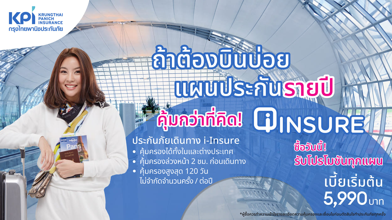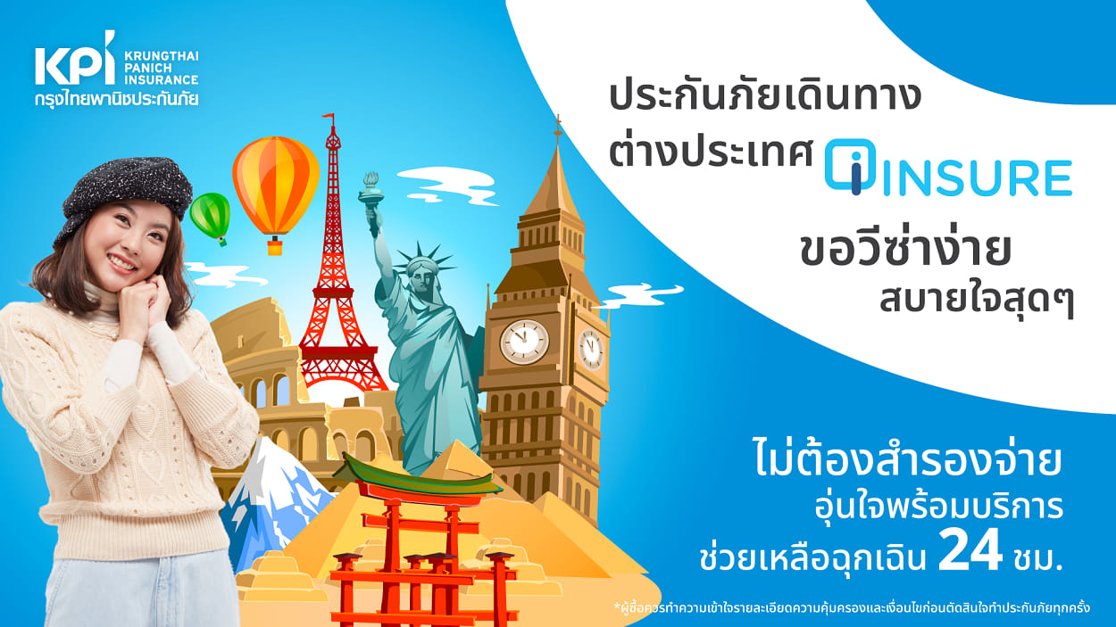 เคพีไอ - บริษัท กรุงไทยพานิชประกันภัย จำกัด (มหาชน) เข้าใจถึงไลฟ์สไตล์ลูกค้าที่รักการเดินทางทุกกลุ่ม จึงได้ออกแบบแผนประกันภัยเดินทาง i-Insure ที่มีความคุ้มครองครอบคลุมให้กับทุกความเสี่ยงภัยที่อาจเกิดขึ้นสำหรับนักเดินทาง ไม่ว่าจะเป็น ความคุ้มครองค่ารักษาพยาบาลจากอุบัติเหตุ เจ็บป่วย กระเป๋าเดินทางสูญหาย ไฟล์ทดีเลย์ การเลื่อนไฟล์ทบิน ทั้งเหตุฉุกเฉินต่างๆ ที่ทำให้อาจต้องยกเลิกเที่ยวบินกะทันหัน แผนประกันภัยเดินทาง i-Insure ยังได้รับการรับรองมาตรฐานเป็นไปตามเกณฑ์ที่สถานทูตกำหนด