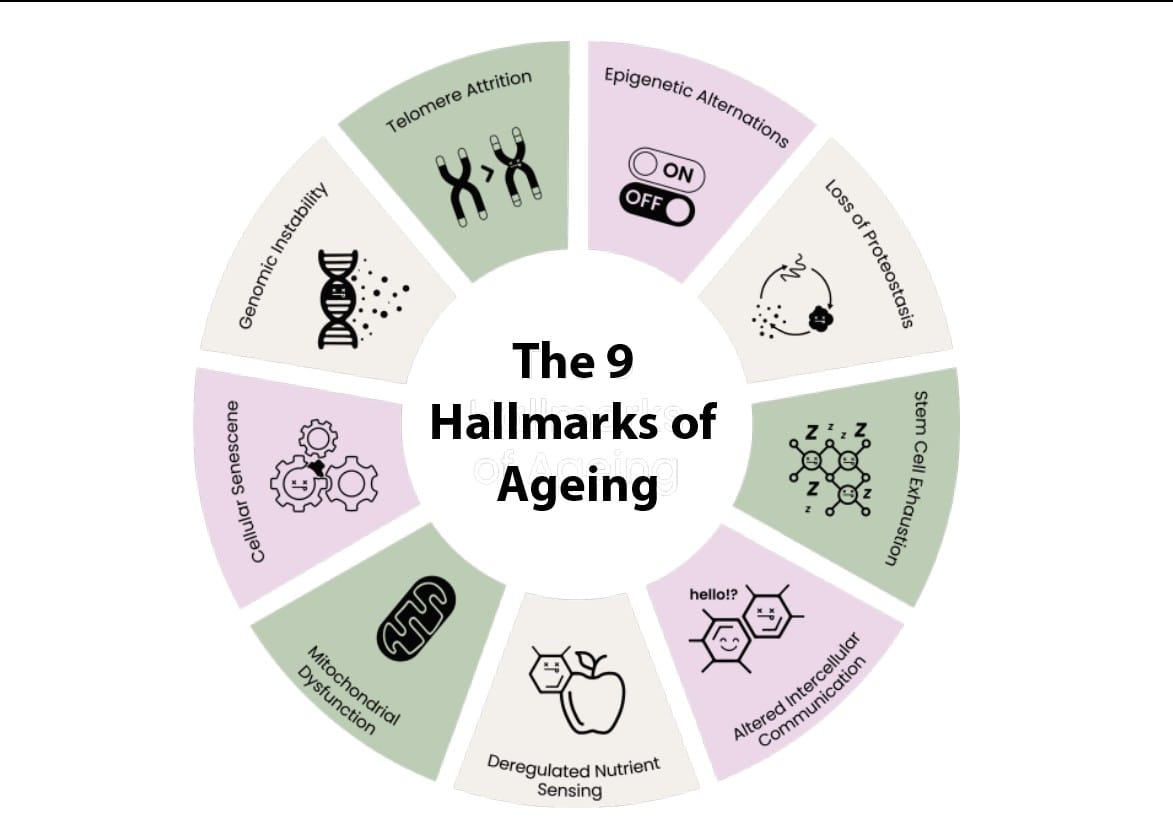 จากผลงานวิจัยทางวิทยาศาสตร์ โดย Carlos Lopez Otin Professor of Biochemistry and Molecular Biology, University of Oviodo ได้แสดงแนวคิดเกี่ยวกับ THE 9 Hallmarks of Aging ซึ่งได้รวมองค์ความรู้เกี่ยวกับปัจจัยต่างๆ ที่มีพบให้เกิดภาวะชรา โดยประกอบด้วย 9 สาเหตุ คือ การสูญเสียเสถียรภาพของจีโนม (Genomic Instabillity) การสึกกร่อนหรือหดสั้นของเทโลเมียร์ (Telomere Attrition) การเปลี่ยนแปลงของภาวะเหนือพันธุกรรม (Epigenetic Alternations) การขาดภาวะสมดุลของโปรตีน (Loss of Proteostasis) การลดการทำงานของสเต็มเซลล์ (Stem Cell Exhaustion) การเปลี่ยนแปลงของการติดต่อสื่อสารระหว่างเซลล์ ( Altered Intercellular Communication) การลดลงหรือความผิดปกติจากการรับรู้สารอาหาร (Deregulated Nutrient Sensing) การเสื่อมสภาพของไมโทคอนเดรีย (Mitochondrial Dysfunction) และการเกิดเซลล์ชราภาพ (Cellular Senescene)