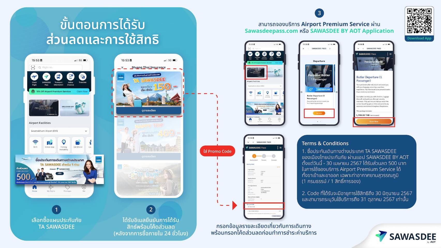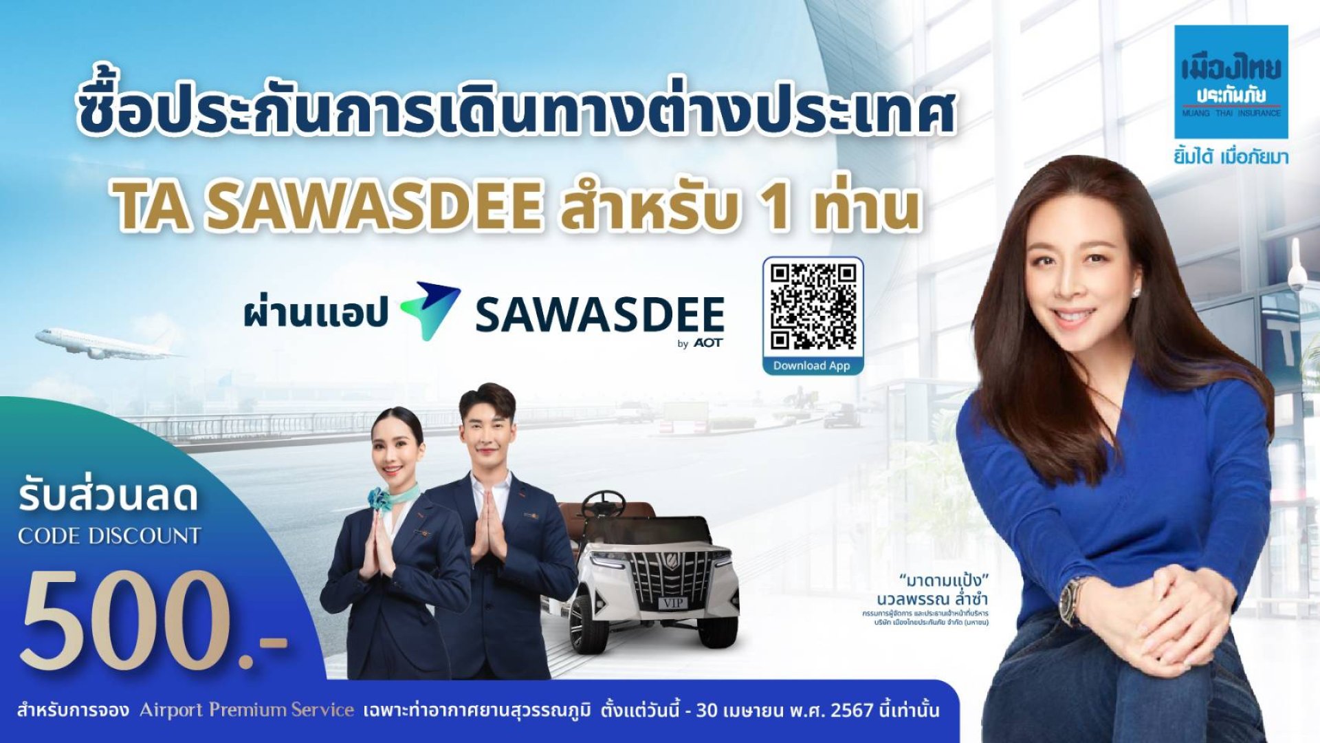 เพราะความปลอดภัยเป็นเรื่องที่สำคัญที่สุดสำหรับทุกคน SAWASDEE by AOT จึงร่วมกับเมืองไทยประกันภัย ส่งแคมเปญสุดพิเศษ "เที่ยวสงกรานต์อุ่นใจ" เอาใจคนเดินทางไกลในช่วงวันหยุดยาว เพียงเลือกซื้อประกันการเดินทางต่างประเทศ TA SAWASDEE แบบรายเดี่ยวจากเมืองไทยประกันภัยผ่านแอปพลิเคชัน SAWASDEE by AOT ตั้งแต่วันนี้ 30 เมษายน 2567 รับทันทีโค้ดส่วนลด 500 บาท สำหรับการจอง Airport Premium Service โดยสามารถใช้บริการได้ทั้งขาเข้าและขาออก ณ ท่าอากาศยานนานาชาติสุวรรณภูมิ (1 กรมธรรม์ต่อ 1 สิทธิ์การจอง)