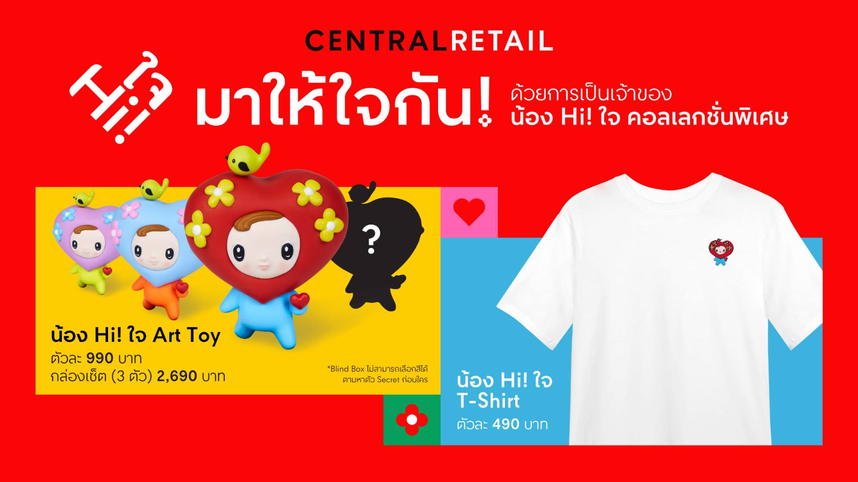 และพิเศษสุด! กับอาร์ตทอยตัวซีเคร็ท (Secret) ที่ชื่อว่า Love ซึ่งมีสีและดีไซน์ไม่เหมือนใคร จำหน่ายเพียง 500 ตัวเท่านั้น! โดยกล่องสุ่มอาร์ตทอยน้อง Hi! ใจ มีให้เลือกทั้งแบบเดี่ยวในราคาตัวละ 990 บาท และแบบเซ็ต 3 ตัว ในราคาเซ็ตละ 2,690 บาท (จากราคาเต็ม 2,970 บาท) นอกจากนี้ยังมีเสื้อยืดสีขาวที่ปักลายน้อง Hi! ใจ จำหน่ายในราคาเพียงตัวละ 490 บาท ให้ได้จับจองเป็นเจ้าของ โดยรายได้ทั้งหมดหลังหักค่าใช้จ่ายจะถูกนำไปสมทบทุนให้กับมูลนิธิเด็กโรคหัวใจ ในพระอุปถัมภ์ของสมเด็จพระเจ้าพี่นางเธอ เจ้าฟ้ากัลป์ยาณิวัฒนา กรมหลวงนราธิวาสราชนครินทร์