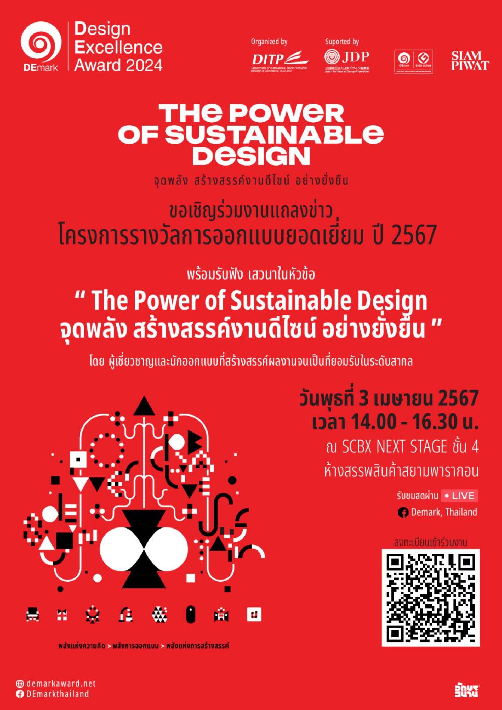 กรมส่งเสริมการค้าระหว่างประเทศ กระทรวงพาณิชย์ จัดงานแถลงข่าวเปิด "โครงการรางวัลการออกแบบยอดเยี่ยม ปี 2567" (DEmark 2024) ภายใต้คอนเซปต์ "The Power of Sustainable Design จุดพลัง สร้างสรรค์งานดีไซน์อย่างยั่งยืน" โดยได้รับเกียรติจาก คุณภูสิต รัตนกุล เสรีเริงฤทธิ์ อธิบดีกรมส่งเสริมการค้าระหว่างประเทศเป็นประธาน พร้อมด้วย น.ส.ประอรนุช ประนุช ผู้อำนวยการสำนักส่งเสริมมูลค่าเพิ่มเพื่อการค้า ร่วมด้วย ผู้บริหาร บริษัท สยามพิวรรธน์ จำกัด