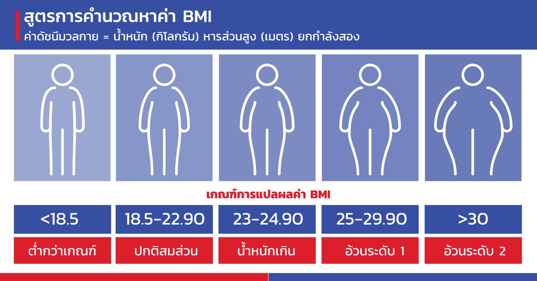 หากใครอยากรู้ว่าเราเริ่มมีความเสี่ยงจากน้ำหนักตัวที่เกินหรือไม่ สามารถตรวจหาความเสี่ยงนี้ได้ด้วยตัวเองโดยใช้สูตรการคำนวณหาค่า BMI หรือ ค่าดัชนีมวลกาย = น้ำหนัก (กิโลกรัม) หารส่วนสูง (เมตร) ยกกำลังสอง เช่น ผู้ป่วยน้ำหนัก 50 กก. สูง 165 ซม. = 50 / (1.65 x 1.65) ค่า BMI = 18.3654 *(ค่าที่ได้น้ำหนักต่ำกว่าเกณฑ์ )