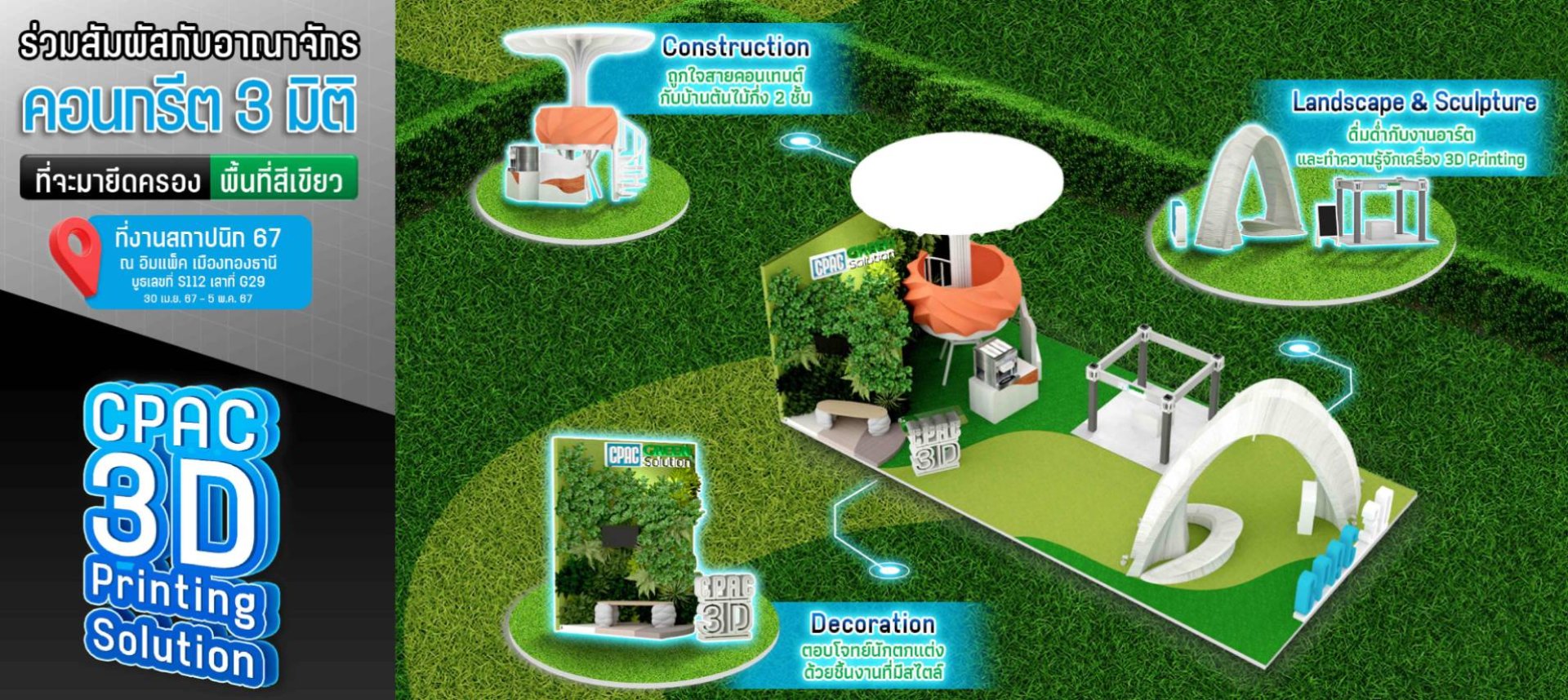 เตรียมตัวปะทะกันได้เลย! กับงาน "สถาปนิก'67: Architect Expo 2024" ที่งานนี้ CPAC Green Solution ผู้นำด้านนวัตกรรมก่อสร้างเพื่อสิ่งแวดล้อม ชวนมาตะลุยอาณาจักร 3D Printing (คอนกรีต 3 มิติ) สุดล้ำ ที่จะทำให้ทุกคนร้องว๊าว! ไปกับผลงานสุดเจ๋งที่เนรมิตมาจากนวัตกรรม CPAC 3D Printing Solution แบบจัดเต็ม ซึ่งผลิตจากปูนซีเมนต์สูตร Low Carbon ครั้งแรกของเมืองไทย โดยครั้งนี้มาในคอนเซ็ปต์ CPAC GREEN CONNECTIVITY กับการรังสรรค์พื้นที่ด้วยแนวคิดการออกแบบพื้นที่เขียว (Green Space) ที่มีการเชื่อมต่อกันอย่างลงตัว