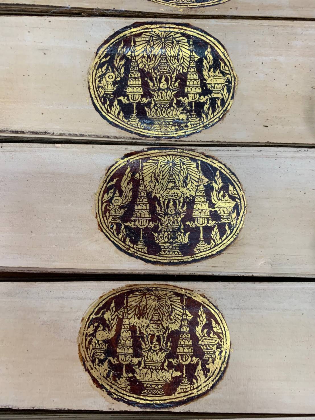 4. คัมภีร์ใบลานสมัยรัตนโกสินทร์ รัชกาลที่ 4 และรัชกาลที่ 5 ได้รับการอนุรักษ์จัดเก็บอย่างเป็นระบบตามหลักวิชาการ โดยใช้ไม้ประกับประกบด้านข้างของคัมภีร์เพื่อเป็นการรักษาทรงไม่ให้โค้งงอ ส่วนกล่องบรรจุคัมภีร์ที่มีมาแต่เดิม จำนวนทั้งสิ้น 87 กล่อง ถือเป็นโบราณวัตถุที่มีความสำคัญเพราะสร้างโดยประณีตศิลป์ เพื่อเก็บรักษาคัมภีร์ มีข้อความจารึกฝังที่สันกล่องระบุปี จ.ศ.1247 (พ.ศ.2428) กล่องประณีตศิลป์นี้จึงมีอายุอย่างน้อย 139 ปี จึงถ่ายโอนภารกิจนี้ให้กับสำนักช่างสิบหมู่ดำเนินการอนุรักษ์ซ่อมแซมต่อไป