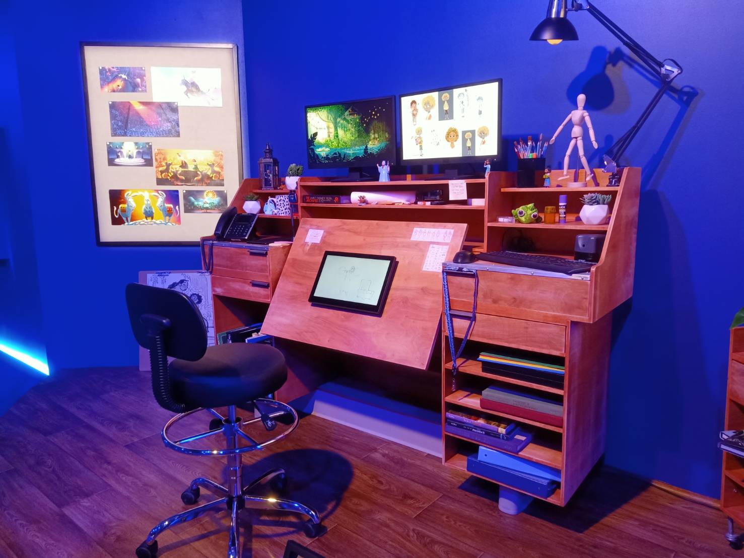 โต๊ะทำงานของนักวาดภาพเคลื่อนไหว มีวิดีโอไทม์แลปส์ การสร้างตัวละคร ฉายอยู่