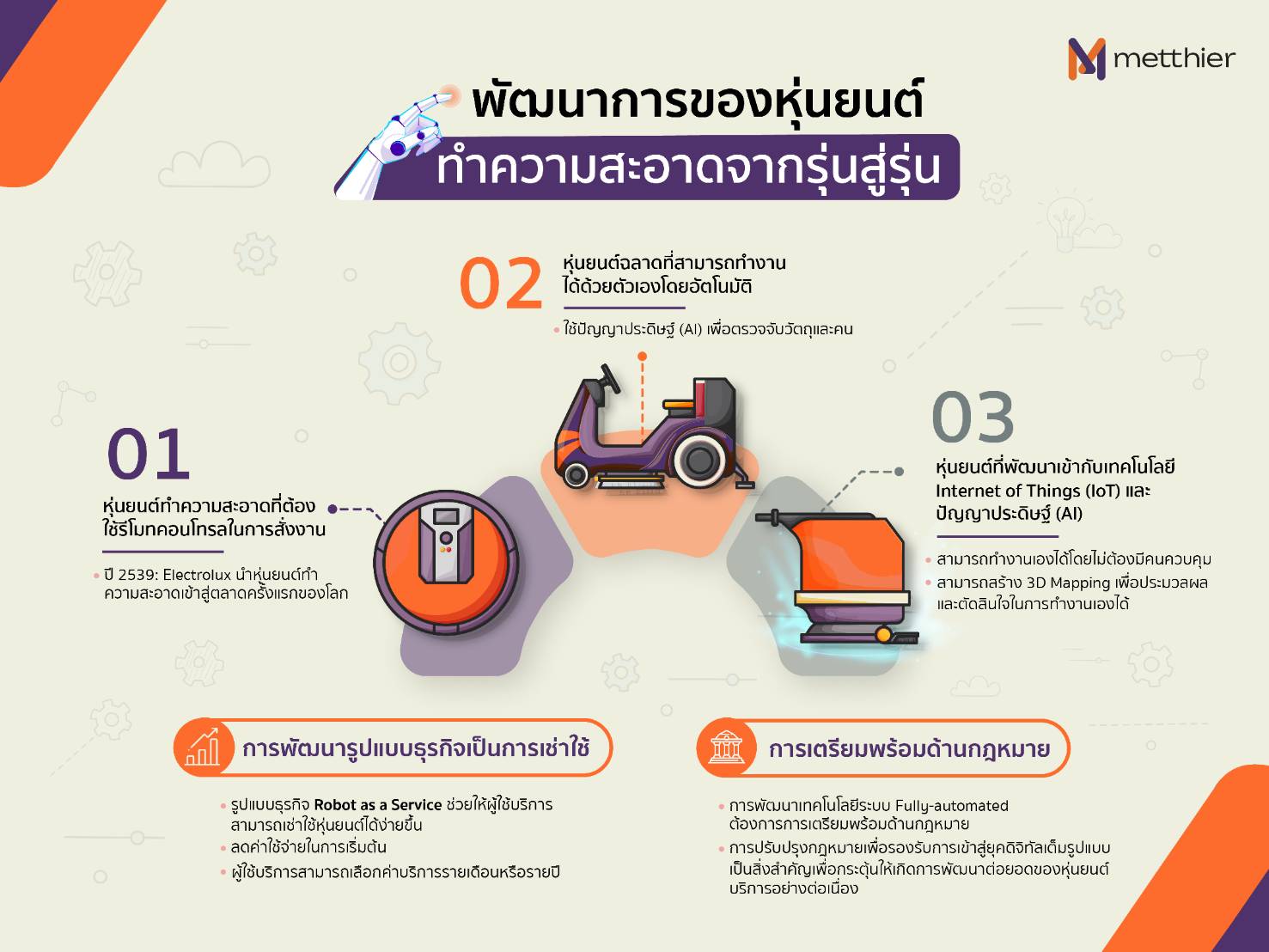 Metthier ผู้ดำเนินธุรกิจการให้บริการการบริหารจัดการอสังหาริมทรัพย์อัจฉริยะแบบครบวงจร (Smart Facility Management) เผยข้อมูลพัฒนาการและความเปลี่ยนแปลงของธุรกิจหุ่นยนต์ทำความสะอาดไว้อย่างน่าสนใจผ่านบทความนี้ในหลายประเด็น ไม่ว่าจะเป็นเรื่องพัฒนาการของหุ่นยนต์ที่ยังต้องทำงานร่วมกับคนไปสู่หุ่นยนต์เจเนอเรชั่น 3 (Gen3) ที่พัฒนาสู่ Internet of Things คือ สามารถทำงานได้เองโดยไม่ต้องมีคนควบคุม โยงถึงพัฒนาการของรูปแบบธุรกิจที่ปรับเปลี่ยนไปเพื่อให้สอดคล้องกับความต้องการของผู้ใช้งานมากยิ่งขึ้น Robot as a Service (การเช่าใช้หุ่นยนต์บริการ) รวมถึงข้อเสนอแนะเกี่ยวกับการปรับปรุงกฎหมายเพื่อรองรับการเข้าสู่ยุคดิจิทัลเต็มรูปแบบในอนาคต