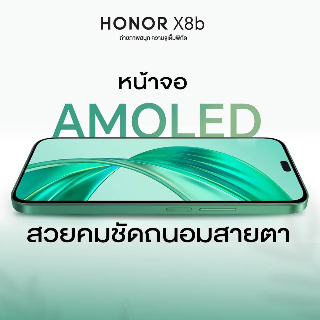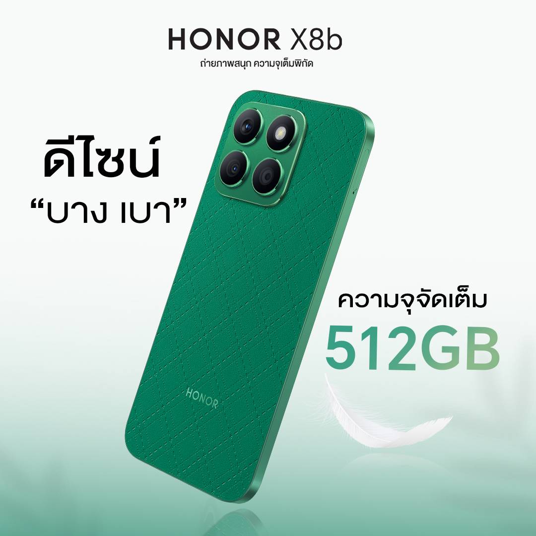 ออเนอร์ (HONOR) ผู้ให้บริการอุปกรณ์อัจฉริยะชั้นนำระดับโลก ประกาศเปิดตัวรุ่นใหม่ล่าสุด HONOR X8b สมาร์ตโฟนดีไซน์พรีเมียมเรียบหรู ภายใต้คอนเซปต์ "ถ่ายภาพสนุก ความจุเต็มพิกัด" โดยรุ่นนี้เป็นสมาร์ตโฟนที่อัดแน่นไปด้วยคุณภาพและนวัตกรรมที่ทันสมัย ในราคาคุ้มค่า เน้นตอบโจทย์ทุกความต้องการของคนรุ่นใหม่โดยเฉพาะสายคอนเทนต์ครีเอเตอร์ ด้วยเทคโนโลยีกล้องหลังความละเอียดสูง พร้อมระบบกล้อง 3 ตัว ได้แก่ กล้องหลักความละเอียด 108MP, กล้อง Wide+Depth ความละเอียด 5MP และกล้องมาโครความละเอียด 2MP กล้องหน้าเซลฟี่ 50 ล้านพิกเซล พร้อม Soft Flashlight เพื่อให้ผู้ใช้เพลิดเพลินกับการถ่ายภาพและได้ภาพถ่ายที่สวยสมบูรณ์แบบในทุกโมเมนต์ ผสานหน้าจอ AMOLED ขนาดใหญ่ 6.7 นิ้ว ตลอดจนให้ความจุมากที่สุดถึง 512GB เมื่อเทียบกับสมาร์ตโฟนทั่วไปในเรทราคาใกล้เคียงกัน สามารถเป็นเจ้าของได้ในราคาคุ้มค่าเพียง 7,999 บาท เริ่มจำหน่ายวันแรกตั้งแต่วันที่ 10 พฤษภาคม 2567 เป็นต้นไป