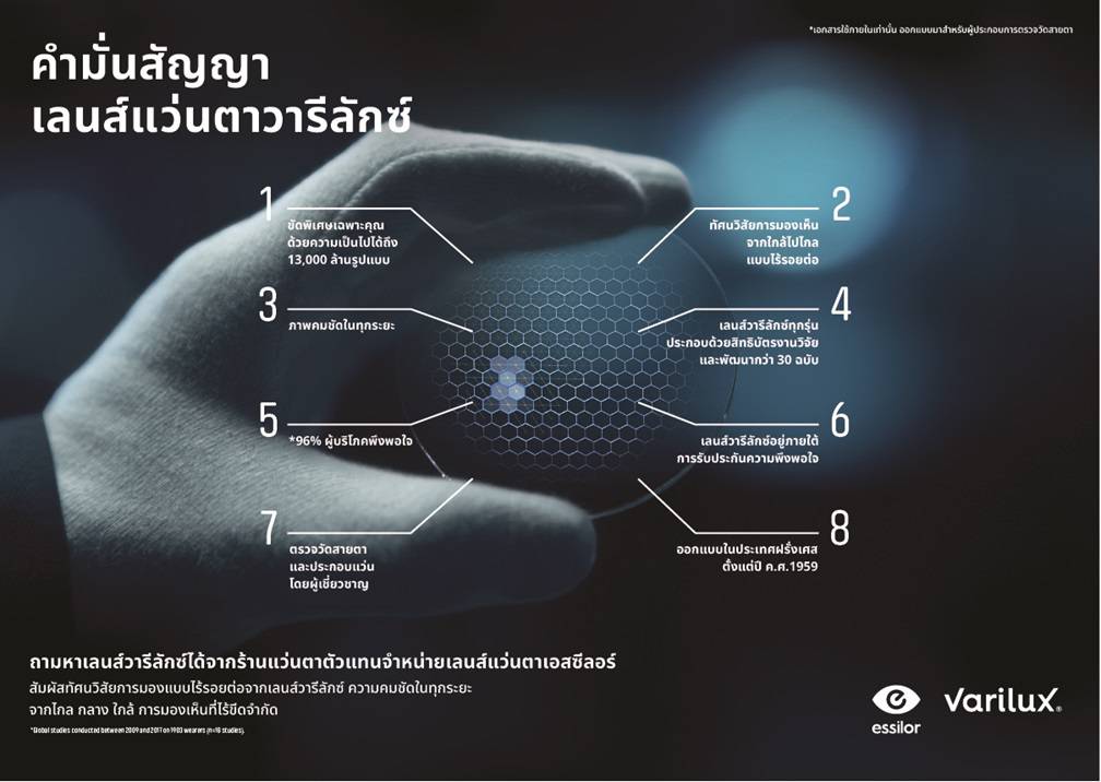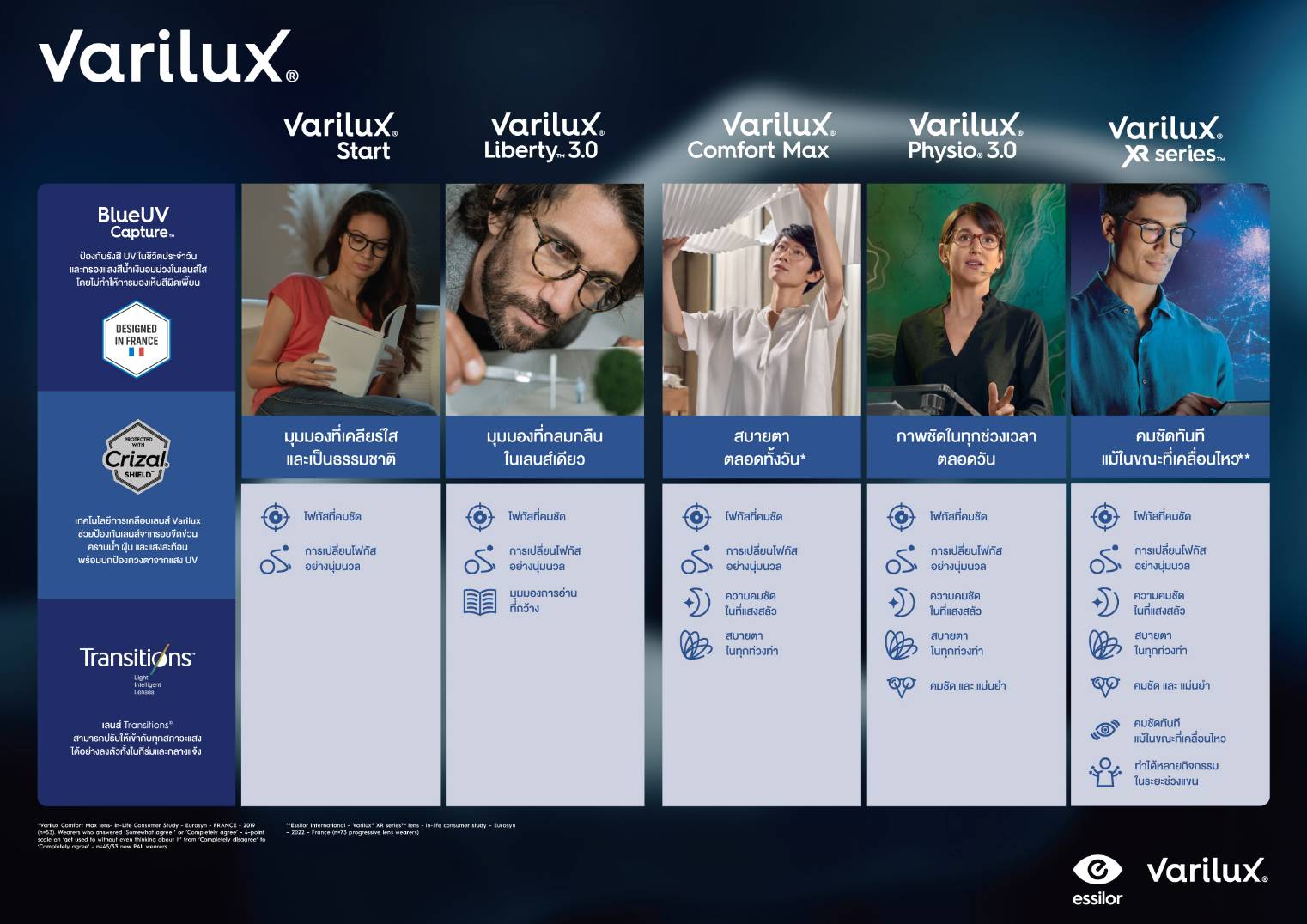 เอสซีลอร์ลูซอตติกา ผู้นำด้าน VISION CARE ผลิตและจำหน่ายเลนส์แว่นตา กรอบแว่น และแว่นกันแดด อันดับ 1 ในประเทศไทย เปิดตัวเลนส์วารีลักซ์ เอ็กซ์อาร์ ซีรีส์ (Varilux XR series) เลนส์โปรเกรสซีฟรุ่นใหม่ล่าสุด ทลายกำแพงการมองเห็นของเลนส์โปรเกรสซีฟแบบเดิมๆ ด้วยการออกแบบเลนส์ร่วมกับปัญญาประดิษฐ (AI) ปรับแต่งเลนส์โดยใช้การทำนายรูปแบบพฤติกรรมการมองในชื่อเทคโนโลยี XR-motion สิทธิบัตรเฉพาะแบรนด์เลนส์โปรเกรสซีฟ วารีลักซ์ ซึ่งเป็นเทคโนโลยีล้ำสมัยล่าสุดของเลนส์โปรเกรสซีฟ Varilux XR series (youtube.com) (VDO Link)