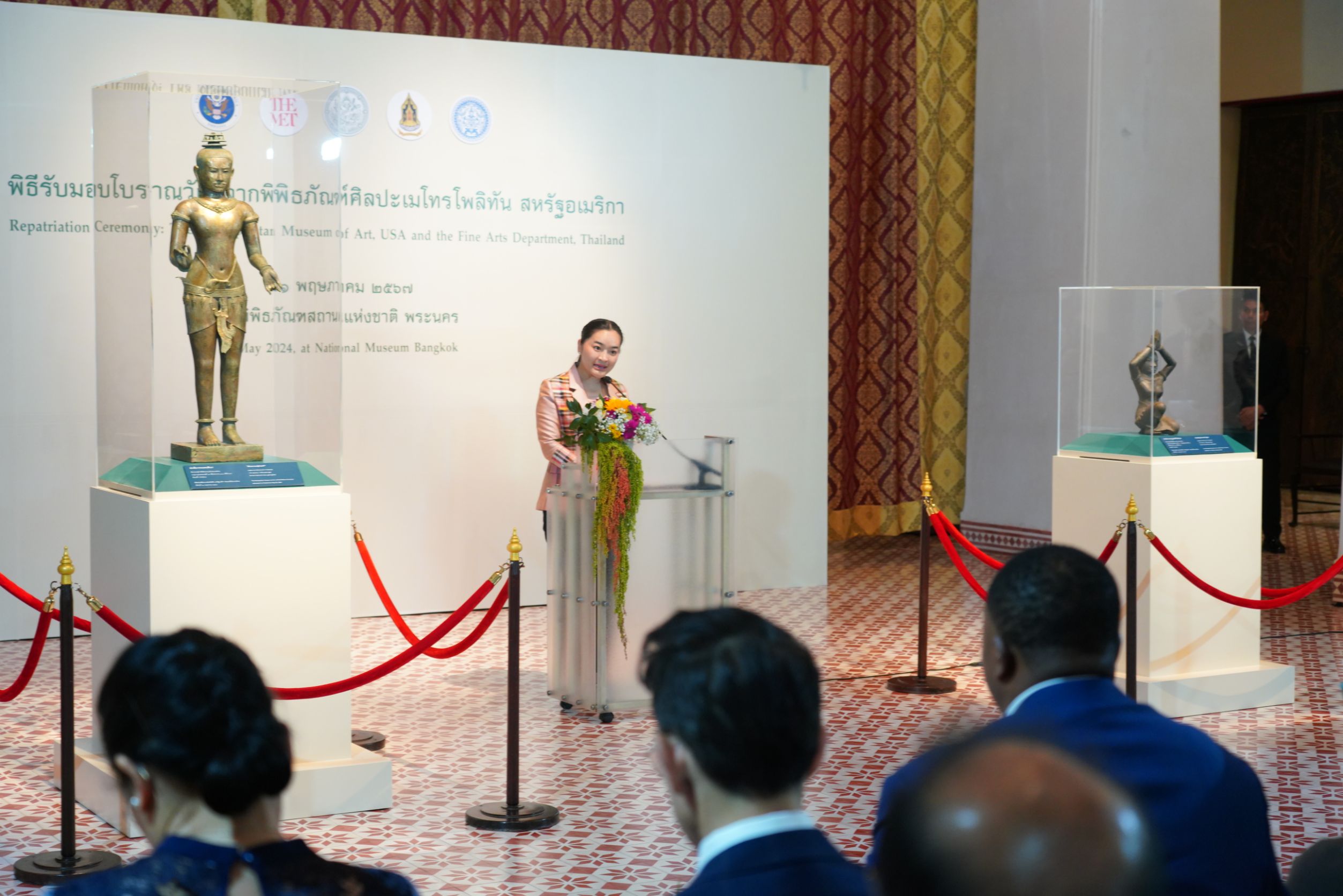 เมื่อวันอังคารที่ 21 พฤษภาคม 2567 เวลา 14.00 น. นางสาวสุดาวรรณ หวังศุภกิจโกศล รัฐมนตรีว่าการกระทรวงวัฒนธรรม (รมว.วธ.) เป็นประธานในพิธีรับมอบโบราณวัตถุ จำนวน 2 รายการ จากพิพิธภัณฑ์ศิลปะเมโทรโพลิทัน สหรัฐอเมริกา โดยมีนางยุพา ทวีวัฒนะกิจบวร ปลัดกระทรวงวัฒนธรรม นายพนมบุตร จันทรโชติ อธิบดีกรมศิลปากร นาย John Guy ผู้แทนพิพิธภัณฑ์ศิลปะเมโทรโพลิทัน สหรัฐอเมริกา พร้อมด้วยคณะกรรมการติดตามโบราณวัตถุของไทยในต่างประเทศกลับคืนสู่ประเทศไทย ผู้บริหารกระทรวงวัฒนธรรม ผู้บริหาร ข้าราชการ และเจ้าหน้าที่กรมศิลปากร เข้าร่วมในพิธีรับมอบ ณ พระที่นั่งอิศราวินิจฉัย พิพิธภัณฑสถานแห่งชาติ พระนคร