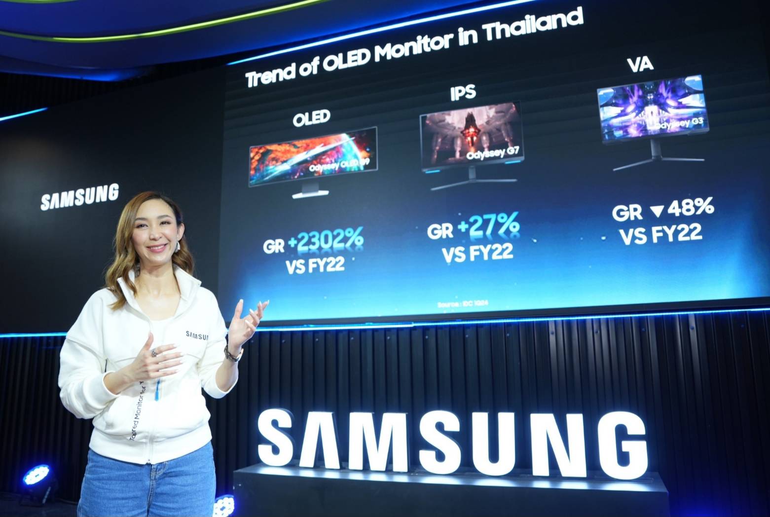 นางสาวอภิรดา พัวพรพงษ์ ผู้อำนวยการกลุ่มธุรกิจผลิตภัณฑ์จอภาพ บริษัท ไทยซัมซุง อิเลคโทรนิคส์ จำกัด เปิดเผยว่า "ซัมซุงมุ่งมั่นที่จะนำเสนอสิ่งที่ดีที่สุดแก่ผู้บริโภค เพื่อตอกย้ำความเป็นผู้นำในตลาดจอมอนิเตอร์พรีเมี่ยม โดยตั้งเป้าการเติบโตในตลาดจอมอนิเตอร์พรีเมี่ยมเพิ่มขึ้นในปี 2567 ผ่านกลยุทธ์เชิงรุกตลาดจอมอนิเตอร์พรีเมี่ยมที่ครอบคลุมทุก Segment ของจอ OLED ด้วยจุดแข็งด้านเทคโนโลยีจากซัมซุง ล่าสุดเปิดตัวจอ OLED เพิ่มขึ้น 2 รุ่น ได้แก่ Odyssey OLED G80SD และ G60SD ที่มาพร้อมการพัฒนาที่สมบูรณ์ยิ่งขึ้นด้วยเทคโนโลยีที่หลากหลายเฉพาะของซัมซุง เพื่อตอบโจทย์ความต้องการทุกประเภทของผู้ใช้ เนื่องจากจอมอนิเตอร์ได้กลายเป็นอุปกรณ์ที่มีความสำคัญอย่างยิ่งในการทำงานและการใช้ชีวิตประจำวันของคนรุ่นใหม่ในยุค Innovative Hybrid Lifestyle ที่มองหาตัวช่วยที่จะเพิ่มประสิทธิภาพในการใช้ชีวิต 3 ด้าน ได้แก่ การประหยัดเวลา (Time Saving), การเพิ่มประสิทธิภาพในการใช้ชีวิต (Life Efficiency) และการเชื่อมต่อแบบไร้รอยต่อ (Seamless Integration) เพื่อให้ทุกวันในการใช้ชีวิต การทำงาน การผ่อนคลาย สามารถเกิดขึ้นได้อย่างมีประสิทธิภาพ ไร้รอยต่อ และประหยัดเวลา นอกเหนือจากผลิตภัณฑ์ที่เราไม่เคยหยุดพัฒนาแล้ว เรามีทีมบริการหลังการขายที่จะดูแลทุกลูกค้าคนสำคัญของเราให้ได้พบกับประสบการณ์การใช้งานที่ดีที่สุด"