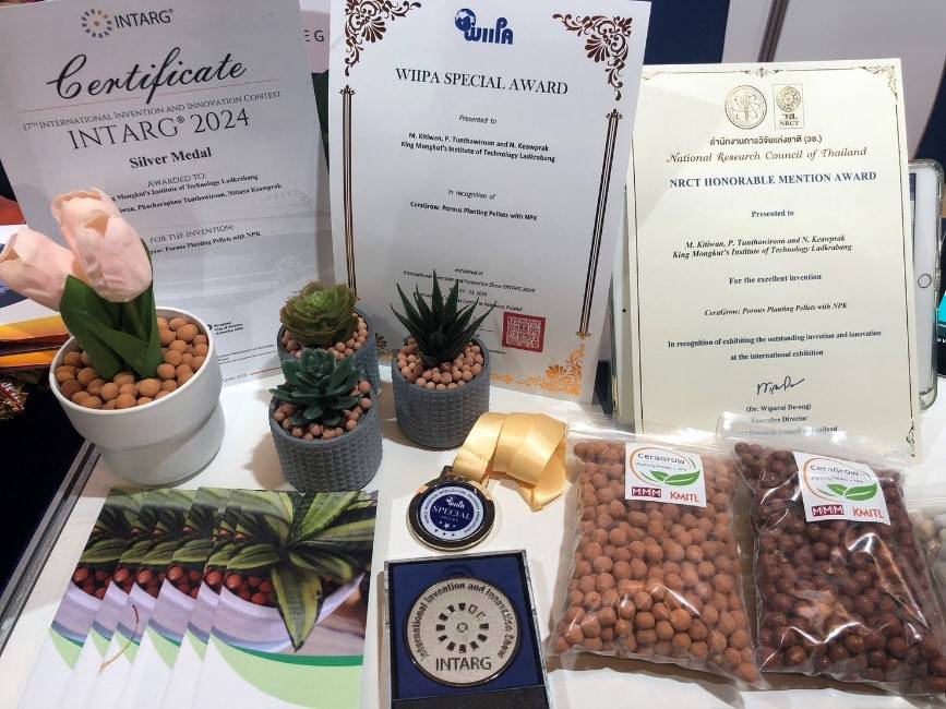 นักวิจัย สถาบันเทคโนโลยีพระจอมเกล้าเจ้าคุณทหารลาดกระบัง (สจล.) คว้ารางวัล "Silver Medal" จาก INTARG 2024 และ Special Award จาก WIIPA (World Invention Intellectual Property associations) จากผลงาน CeraGrow: Porous Planting Pellets with NPK (เซราโกรว: เม็ดดินรูพรุนเสริมธาตุอาหารพืช) ในงาน The 17th International Invention and Innovation Show: INTARG 2024 เมื่อวันที่ 21-23 พฤษภาคม 2567 ณ MCK Katowice, International Congress Centre เมืองคาโตไวซ์ สาธารณรัฐโปแลนด์ โดยเป็นผลงานของ ผศ. ดร.เมตยา กิติวรรณ ภาควิชาฟิสิกส์ คณะวิทยาศาสตร์ และผศ. ดร.พชรพล ตัณฑวิรุฬห์ ภาควิชาวิศวกรรมอุตสาหการ คณะวิศวกรรมศาสตร์ สจล.