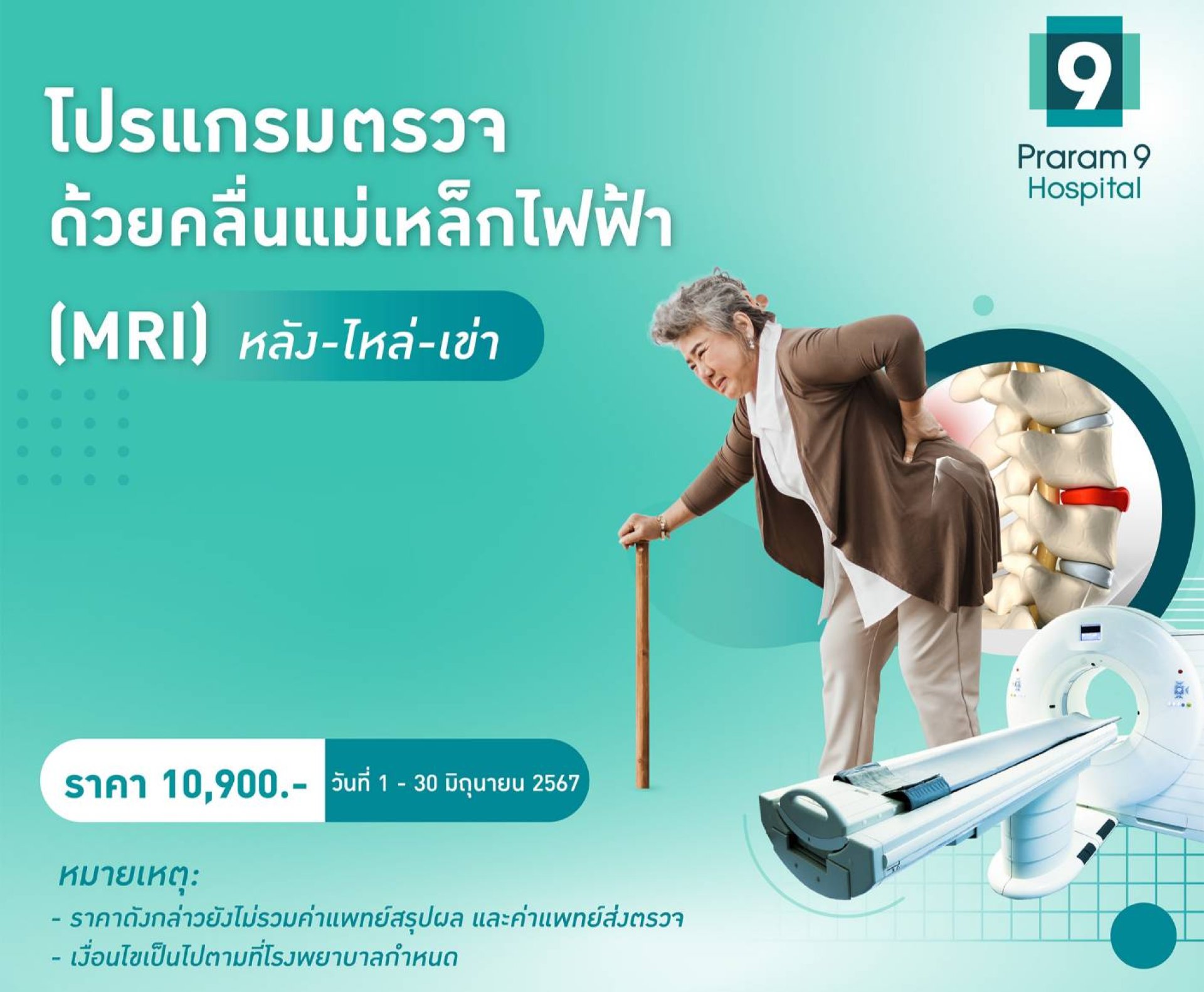 "โรงพยาบาลพระรามเก้า" เอาใจคนรักสุขภาพและผู้ที่มีอาการปวดหลัง-ไหล่-เข่า เรื้อรัง จัดโปรโมชันตรวจ หลัง-ไหล่-เข่า ด้วยคลื่นแม่เหล็กไฟฟ้า (MRI) เช็กให้ชัวร์อาการปวดที่เป็นอยู่ คือ โรคออฟฟิศซินโดรม หรือสัญญาณเสี่ยงโรคกระดูก โดยผู้ที่สนใจสามารถซื้อแพ็กเกจตรวจเอกซเรย์ กระดูกสันหลังส่วนคอ, กระดูกสันหลังส่วนเอว, กระดูกสันหลังส่วนอก, กระดูกสันหลังทุกส่วน, ไหล่ซ้าย-ไหล่ขวา และข้อเข่าซ้าย-ข้อเข่าขวา ในราคาพิเศษ!!!! ทุกรายการเพียง 10,900 บาท