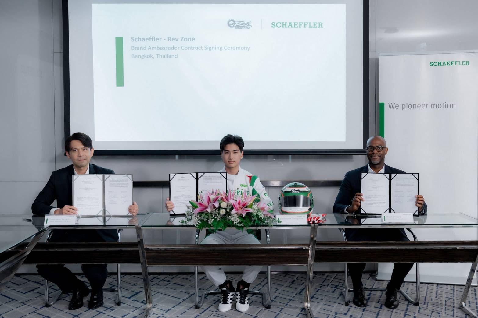 โดยในพิธีลงนามประกาศแต่งตั้งแบรนด์ แอมบาสเดอร์ของแชฟฟ์เลอร์ในครั้งนี้ ได้รับเกียรติจากผู้บริหาร บริษัท แชฟฟ์เลอร์เข้าร่วมงานดังนี้ ในภาพจากซ้าย นายไมก้า เชฟพาร์ด ประธานบริหารฝ่ายงานอะไหล่ทดแทน บริษัทแชฟฟ์เลอร์ ประจำภูมิภาคเอเชียแปซิฟิก "นายโรเตอร์ - ไพชยนต์ ทองเจือ" แบรนด์แอมบาสเดอร์ของแชฟฟ์เลอร์ และนายชัชวาล ส้มจีน ผู้จัดการประจำประเทศไทย และประธานฝ่ายงานอะไหล่ทดแทน บริษัท แชฟฟ์เลอร์ ประจำประเทศญี่ปุ่น และภูมิภาคเอเชียตะวันออกเฉียงใต้