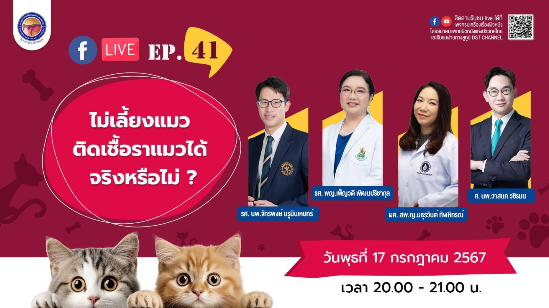 สมาคมแพทย์ผิวหนังแห่งประเทศไทย หรือ DST ขอเชิญประชาชนและผู้สนใจทั่วไป เข้ารับชม Facebook Live ผ่านเพจ เฟซบุ๊ก "ครบเครื่องเรื่องผิวหนัง" ใน EP.41 ในหัวข้อ "ไม่เลี้ยงแมว...ติดเชื้อราแมวได้หรือไม่" ในวันพุธที่ 17 กรกฎาคม 2567 เวลา 20.00-21.00 น. สำหรับเรื่องราวหลักของเชื้อราในแมวหรือในสัตว์เลี้ยง จะเกิดจากความชื้นสะสมตามส่วนต่าง ๆ ของร่างกายสัตว์ ไม่ว่าจะเป็นการอาบน้ำแล้วไม่เป่าขนให้แห้งสนิท หรือการที่เจ้าของปล่อยสัตว์เลี้ยงออกไปเดินหรือเล่น บนพื้นที่มีความชื้น อย่างพื้นดิน หรือ พื้นหญ้าชื้น โดยไม่ทำความสะอาดสัตว์เลี้ยงสม่ำเสมอ ก็ยิ่งมีโอกาสติดเชื้อราได้ง่ายขึ้น แน่นอนว่าแมวขนยาวจะมีความเสี่ยงในการเป็นโรคนี้มากกว่าแมวขนสั้น เพราะสามารถเกิดการสะสมความชื้นได้มากกว่า