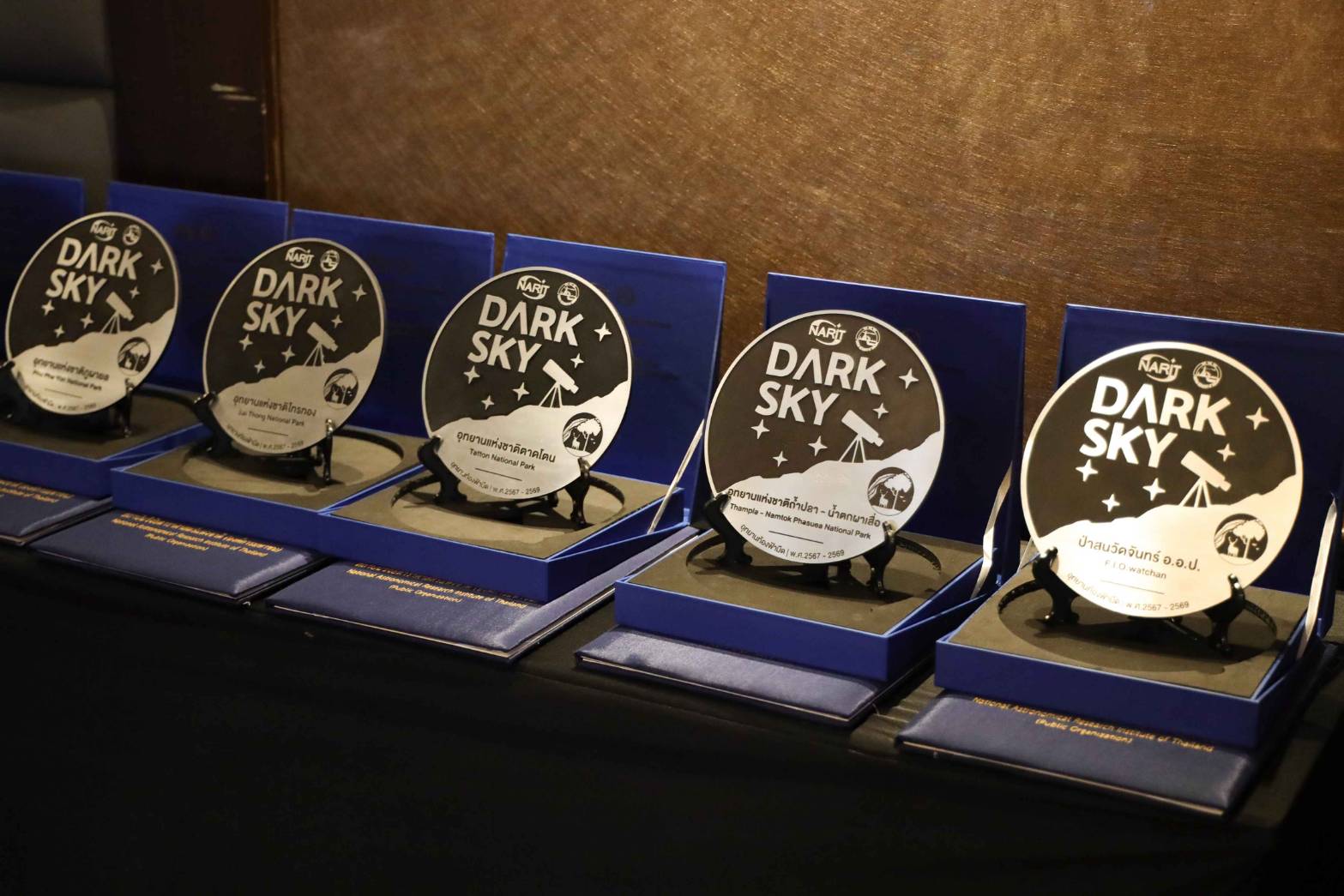 -อุทยานท้องฟ้ามืด (Dark Sky Park) จำนวน 6 พื้นที่ ได้แก่ สวนป่าบ้านวัดจันทร์ องค์การอุตสาหกรรมป่าไม้ จ.เชียงใหม่ อุทยานแห่งชาติถ้ำปลา-น้ำตกผาเสื่อ จ.แม่ฮ่องสอน อุทยานแห่งชาติตาดโตน จ.ชัยภูมิ อุทยานแห่งชาติไทรทอง จ.ชัยภูมิ อุทยานแห่งชาติภูผายล จ.สกลนคร และอุทยานแห่งชาติภูเวียง จ.ขอนแก่น