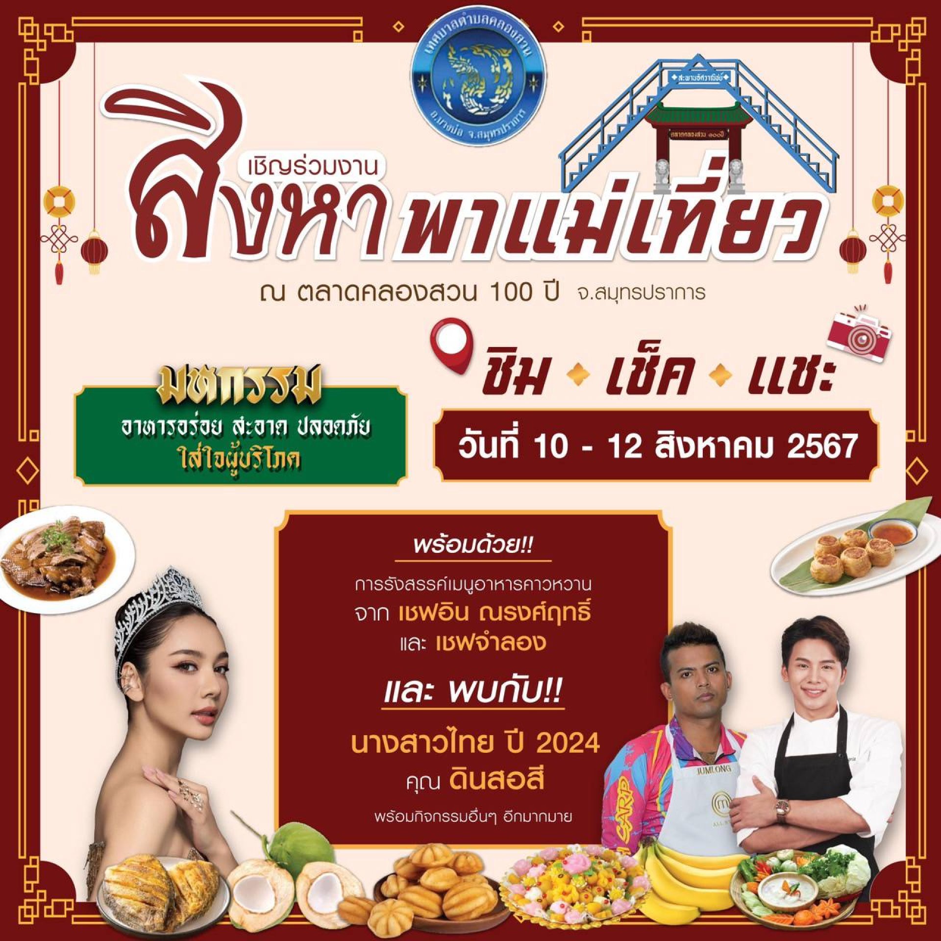 รวมทั้งกิจกรรมพิเศษชมการรังสรรค์อาหารจากวัตถุดิบชั้นเลิศจากชุมชนตำบลคลองสวน พร้อมร่วมชมและชิม กิจกรรมการรังสรรค์ เมนูอาหาร เมนูเด็ด โดยเน้นการใช้วัตถุดิบในท้องถิ่น จาก "เชฟอิน ณรงค์ฤทธิ์" เชฟดังในโลกโซเชียล และ "เชฟจำลอง" จากรายการมาสเตอร์เชฟ นอกจากนี้ภายในงานยังได้พบกับ นางสาวไทยประจำปี 2567 "คุณดินสอสี" และกิจกรรมอื่นๆ อีกมากมาย โดยงานจะจัดตั้งแต่วันที่ 10-12 สิงหาคม 2567 นี้ ตั้งแต่เวลา 08.00 17.00 น. ณ บริเวณตลาดคลองสวน 100 ปี อำเภอบางบ่อ จังหวัดสมุทรปราการ แล้วพบกันนะครับ