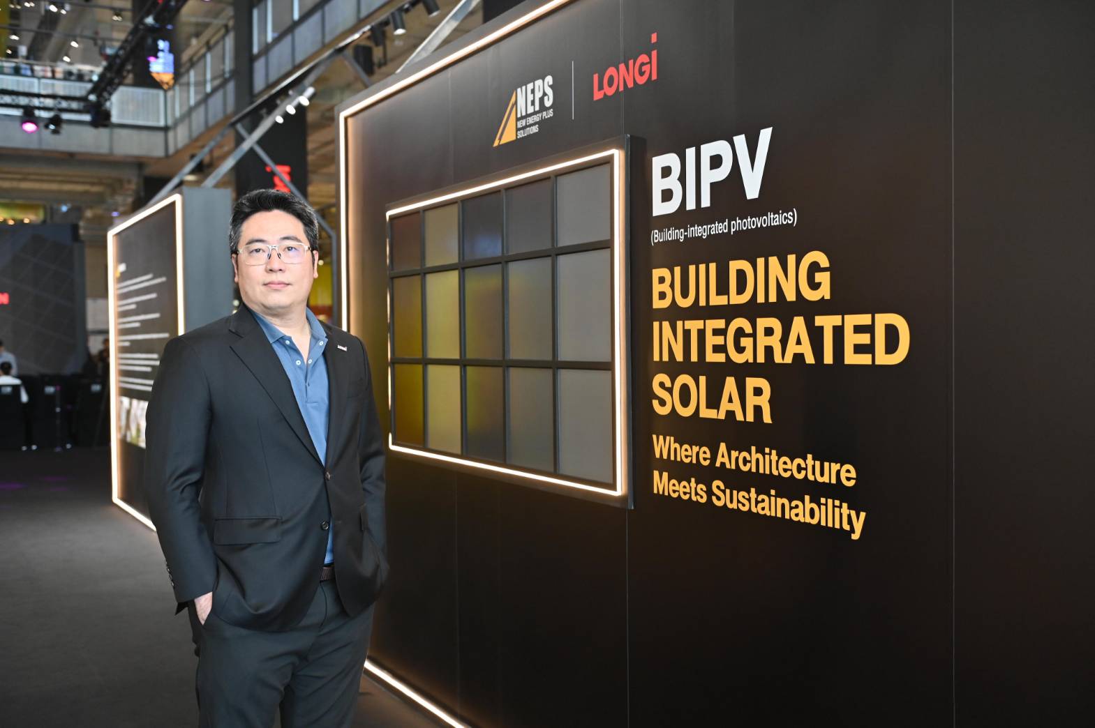 "ขณะที่ "BIPV" หรือ เซลล์แสงอาทิตย์ที่รวมเข้าเป็นส่วนหนึ่งของอาคาร เป็นการนำแผงโซลาร์มาผสานกับวัสดุก่อสร้างที่ใช้ประกอบภายนอกอาคารได้ เช่น กำแพง หน้าต่าง Façade ช่องกระจก หรือผนัง ซึ่งจะช่วยให้อาคารสามารถรับพลังงานแสงอาทิตย์ได้รอบด้าน โดย LONGi เป็นบริษัทต้นในโลกที่คิดค้น พัฒนา และผลิตด้วยตัวเอง 100% BIPV มาพร้อมประสิทธิภาพสูงสุดถึง 25.80% ขณะเดียวกันในแง่ของงานดีไซน์สามารถแมตช์กับงานสถาปัตยกรรมได้ทุกรูปแบบ และ Custom ได้เองทั้งหมด ทั้ง ขนาด รูปทรง และสี ทั้งนี้ทาง LONGi ได้กำหนด 5 สีหลักที่เหมาะสมกับงานดีไซน์อาคาร ได้แก่ Ocean Blue, Space Gray, Eclipse Red, Galaxy Silver และ Cosmic Beige และหากลูกค้าต้องการสีที่นอกเหนือจากทั้ง 5 สีนี้ก็สามารถกำหนดได้โดยการดู Code สีจากอาคารภายนอกของลูกค้าเอง มาพร้อมการรับประกันสินค้านานถึง 15 ปี รับประกันการผลิตพลังงาน 25 ปี และรับประกันตัวสี 10 ปี"