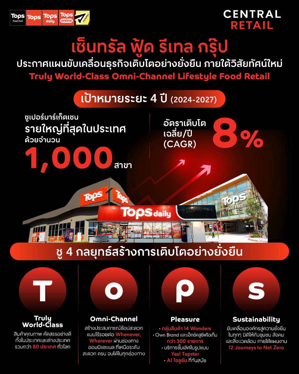 "เซ็นทรัล ฟู้ด รีเทล กรุ๊ป" ฉลองครบรอบ 28 ปี ท็อปส์ ประกาศวิสัยทัศน์ใหม่ "Truly World-Class Omni-Channel Lifestyle Food Retail" ตั้งเป้าครองตำแหน่งซูเปอร์มาร์เก็ตเชนรายใหญ่ที่สุดในประเทศ ด้วยสาขากว่า 1,000 แห่งภายในปี พ.ศ. 2570 ย้ำภาพผู้นำเบอร์ 1 ธุรกิจฟู้ดรีเทลเมืองไทย