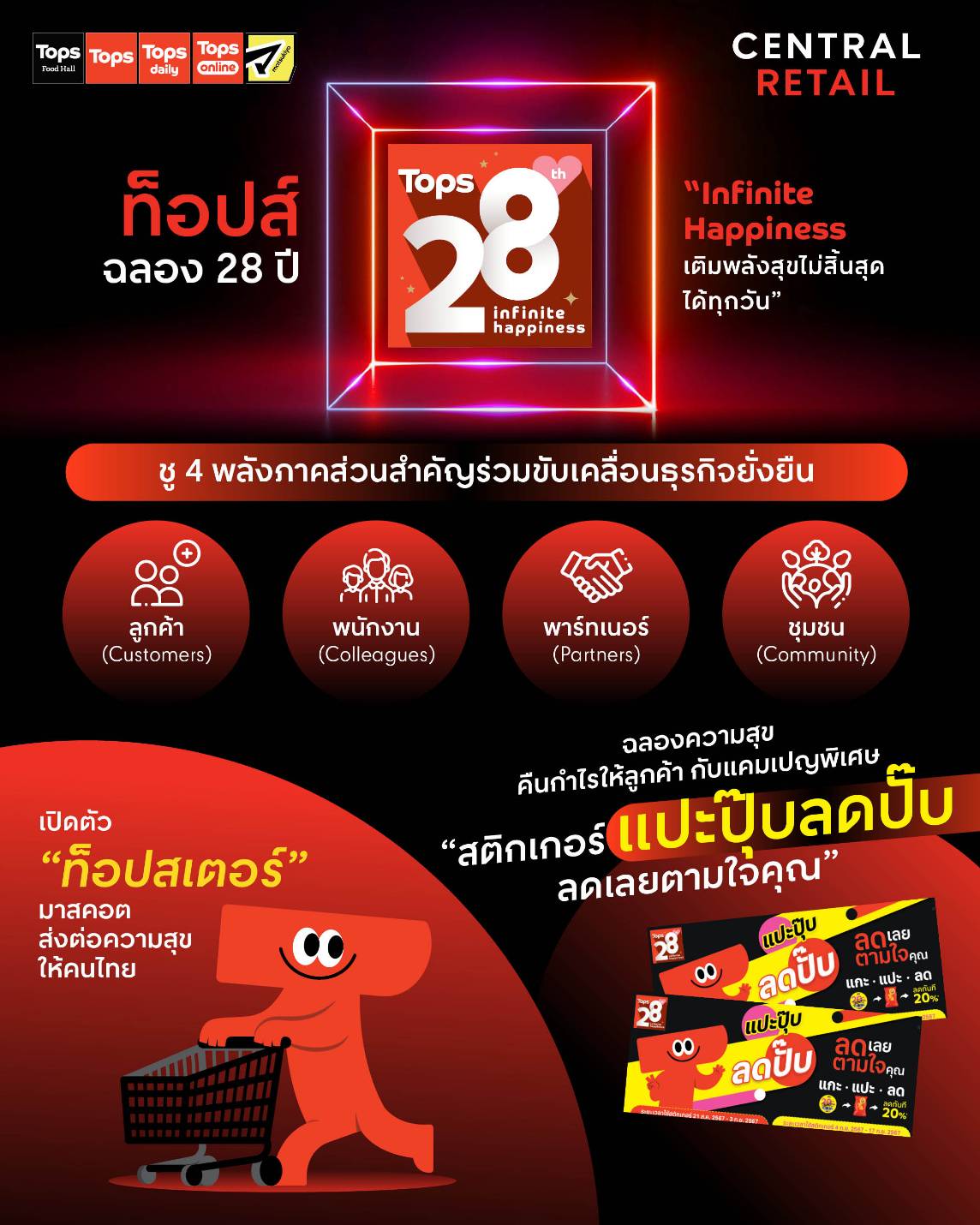 นอกจากนี้ เพื่อเป็นการฉลองครบรอบ 28 ปี ท็อปส์ ได้เตรียมของขวัญสุดพิเศษเพื่อแทนคำขอบคุณไปยังเพื่อนร่วมเดินทางตลอด 28 ปีของท็อปส์ ได้แก่ ลูกค้าคนสำคัญ พนักงาน พาร์ทเนอร์ทางธุรกิจ และชุมชน ภายใต้แนวคิด Infinite Happiness เติมพลังสุขไม่สิ้นสุดได้ทุกวัน ส่งมอบความคุ้มค่าด้วยแคมเปญ "สติกเกอร์ แปะปุ๊บลดปั๊บ ลดเลยตามใจคุณ" สำหรับลูกค้าสมาชิก The1 เพียงซื้อสินค้าครบตามที่กำหนดรับสติกเกอร์ส่วนลดทันทีสูงสุด 20% ติดสติกเกอร์บนสินค้าที่ต้องการ รับส่วนลดแบบที่ตนเลือกได้เองทันที สะสมสติกเกอร์ได้ง่ายๆ เพียงซื้อสินค้าครบ 300 บาท/ใบเสร็จ รับสติกเกอร์ส่วนลดสูงสด 10% 1 แผ่น หรือซื้อสินค้าครบ 800 บาท/ใบเสร็จ รับสติกเกอร์ส่วนลดสูงสด 15% 1 แผ่น หรือซื้อสินค้าครบ 1,200 บาท/ใบเสร็จ รับสติกเกอร์ส่วนลดสูงสด 20% 1 แผ่น ตั้งแต่วันที่ 21 สิงหาคม - 10 กันยายน 2567 ที่ ท็อปส์ ฟู้ด ฮอลล์, ท็อปส์ และ ท็อปส์ เดลี่ ทุกสาขาทั่วประเทศ