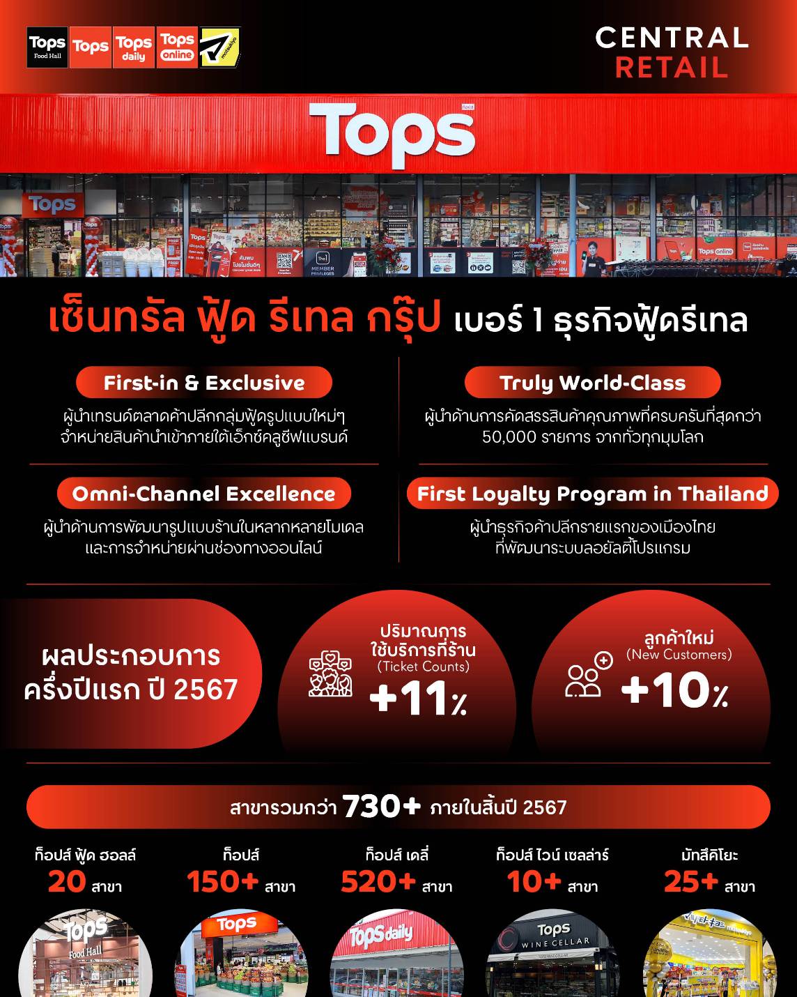 จากศักยภาพแห่งความเป็นผู้นำรอบด้าน ส่งผลให้เซ็นทรัล ฟู้ด รีเทล กรุ๊ป ประสบความสำเร็จในการยกระดับประสบการณ์การช้อปปิ้งให้กับลูกค้า รวมทั้งการเติบโตของธุรกิจและองค์กรอย่างต่อเนื่อง สะท้อนผ่านความสำเร็จในช่วงครึ่งแรกของปี 2567 ซึ่งมีปริมาณการใช้บริการที่ร้าน (Ticket Counts) เพิ่มขึ้น 11% และมีจำนวนลูกค้าใหม่เพิ่มขึ้น 10% เมื่อเทียบกับปีที่แล้ว ขณะเดียวกันได้เดินหน้าขยายสาขาในแต่ละพื้นที่ เพื่อเข้าถึงลูกค้าอย่างครอบคลุม ซึ่งในสิ้นปีนี้ "ท็อปส์" จะมีสาขาเปิดให้บริการครอบคลุมในทุกฟอร์แมตรวมกว่า 730 สาขา ได้แก่ ท็อปส์ ฟู้ด ฮอลล์ 20 สาขา ท็อปส์ ซูเปอร์มาร์เก็ตรวมมากกว่า 150 สาขา ท็อปส์ เดลี่ อีกกว่า 520 สาขา ท็อปส์ ไวน์ เซลล่าร์ มากกว่า 10 สาขา และ มัทสึคิโยะ อีก 25 สาขา อีกทั้งยังวางแผนขยายและ อัปเกรดสาขาอย่างต่อเนื่องเฉลี่ยมากกว่า 100 สาขาต่อปี