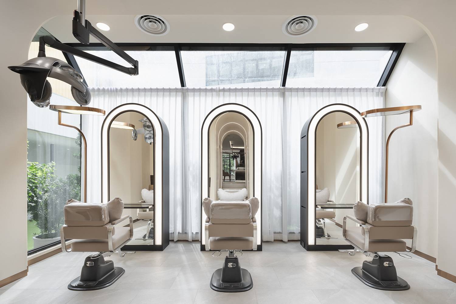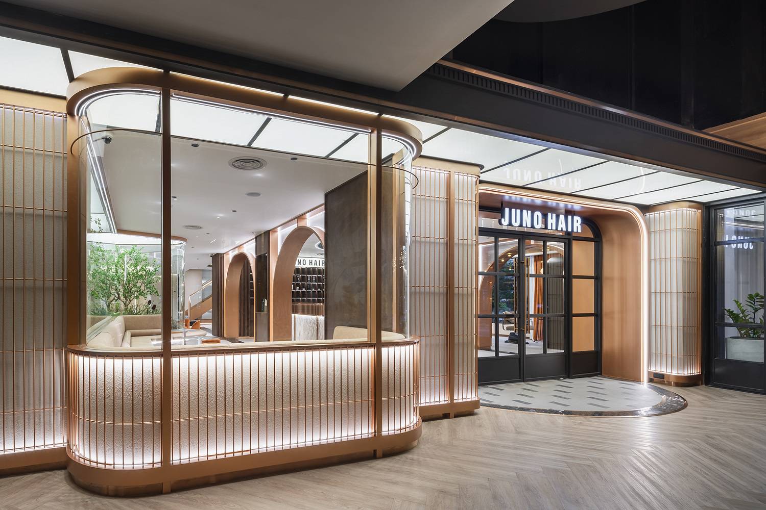 บรรยากาศของร้านก็เป็นส่วนสำคัญสำหรับการเติมเต็มประสบการณ์พรีเมียมเช่นกัน เมื่อเข้ามาที่ซาลอน JUNO HAIR ณ โรงแรมกราฟ รัชดาภิเษก จะพบการออกแบบร้านที่ถอดแบบมาจากซาลอนผมที่เกาหลี คลุมโทนด้วยสีขาว น้ำตาล และทองนอกจากจะให้สัมผัสที่ดูหรูหรา ยังมอบความรู้สึกอบอุ่น และผ่อนคลาย โดยคำว่า "JUNO" มาจาก ชื่อของเทพปกรณัมสมัยโรมัน และได้นำมาตั้งชื่อห้องต่างๆ ภายในซาลอน มีจุดเด่นแรกคือดิสเพลย์ที่ภายในเป็นสวนดอกไม้ขนาดย่อมให้ความรู้สึกที่ผ่อนคลายและเพลินตา ทุกพื้นที่ของซาลอน ทีมงานจากเกาหลีใต้ จะมาร่วมให้คำแนะนำในการกำหนดสัดส่วน และตำแหน่งจัดวางของ เก้าอี้ทำผม กระจกเงา และอุปกรณ์ของช่างทำผมที่ส่งตรงจากเกาหลีเช่นกัน เพื่อให้ลูกค้าได้รับความเป็นส่วนตัวมากที่สุด ด้านในมีพื้นที่พิเศษสำหรับการนัดหมายเพื่อรับการบริการออกแบบทรงผมจากไดเรกเตอร์ หรือช่างที่ได้รับการอบรมขั้นสูงสุดจากมาสเตอร์ พื้นที่ส่วนกลางจัดไว้สำหรับให้ลูกค้าที่มาใช้บริการ ได้ work from anywhere หรือพักผ่อนเปลี่ยนอิริยาบถ ส่วนชั้นบนยังมี Private Room สำหรับให้สมาชิกได้รับบริการแบบเป็นส่วนตัว หรือจะพาเพื่อนมาปาร์ตี้เล็กๆ ก็มีอุปกรณ์อำนวยความสะดวกพร้อมสรรพ