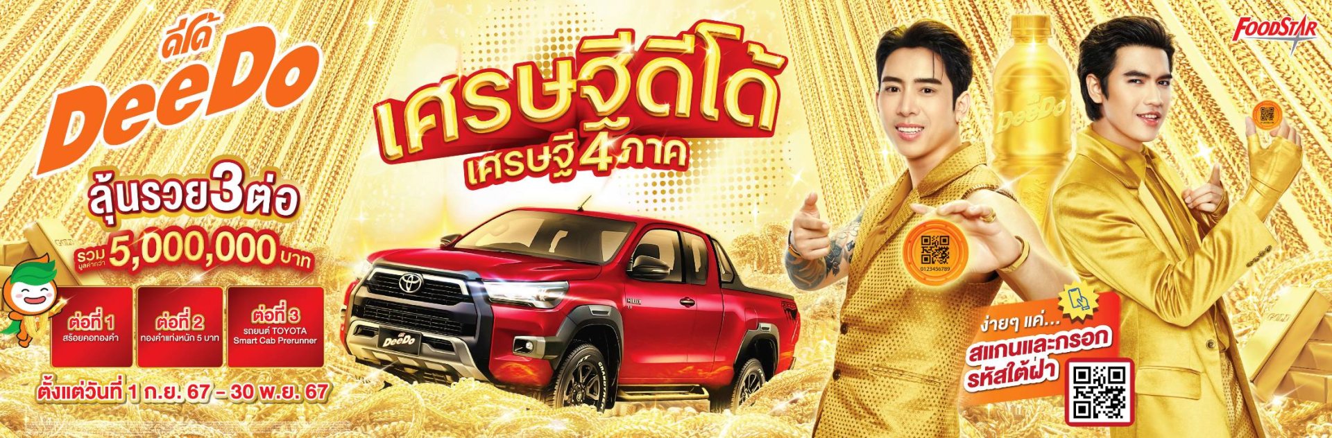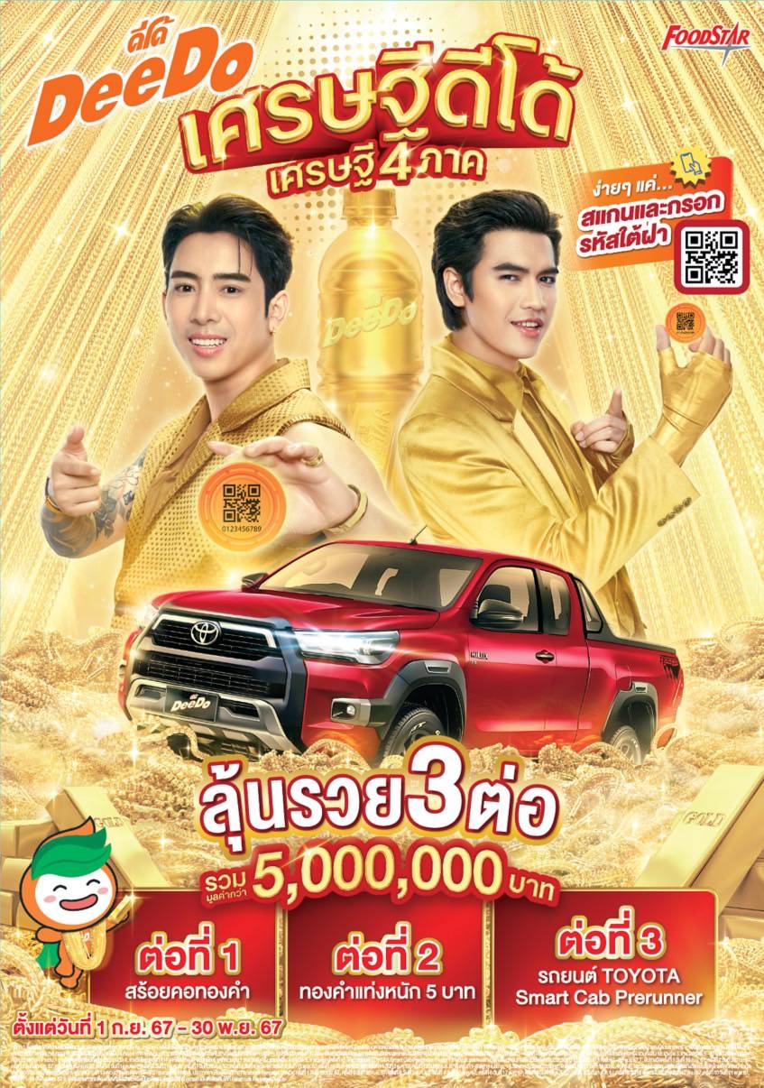 และ ต่อที่ 3 ลุ้นรางวัลใหญ่ รถกระบะ TOYOTA Smart Cab Prerunner จำนวน 1 รางวัล รวมมูลค่า 911,000 บาท รวมจำนวนของรางวัลทั้งรายการ 313 รางวัล รวมมูลค่าทั้งสิ้น 5,232,302 บาท โดยสามารถร่วมลุ้นเป็นเศรษฐีง่าย ๆ เพียงซื้อผลิตภัณฑ์ดีโด้ ทุกรสชาติ ขนาด 450 ml. และ 225 ml. และสแกน QR Code และกรอกรหัสใต้ฝาดีโด้ ลงทะเบียน ชื่อ นามสกุล หมายเลขโทรศัพท์ จังหวัด (โปรดระบุตามหน้าบัตรประชาชนเท่านั้น) ดีโด้ยิ่งบิดเยอะยิ่งมีสิทธิ์รวย อย่ารอช้า!! เพียงเท่านี้ก็มีสิทธิ์ได้เป็นเศรษฐีคนต่อไป