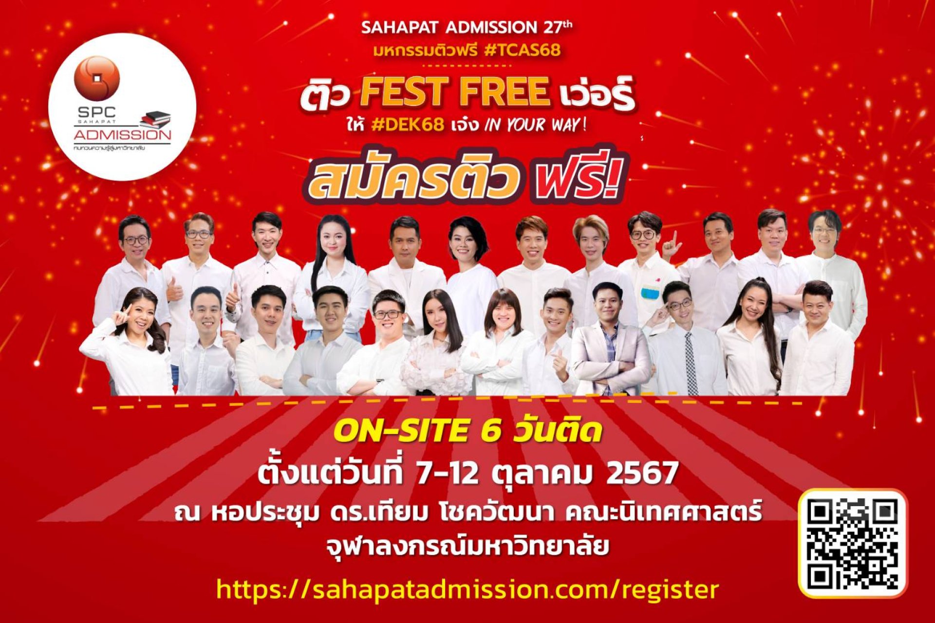 "สหพัฒน์แอดมิชชั่น ครั้งที่ 27" ติวเดียวแห่งปี ที่เนื้อหาเข้มข้น เน้นทั้ง วิชาการ และ ความสนุกสนาน ที่ปีนี้มาด้วยแนวคิด "Sahapat Admission ครั้งที่ 27" ติว FEST FREE เว่อร์ให้ #DEK68 เจ๋ง IN YOUR WAY! โอกาสเดียวของ DEK68 ที่จะได้ติวเข้มข้นกับติวเตอร์ชั้นนำแบบตัวเป็นๆ โดยการจัดติวสด 6 วันติด ติว 12 วิชากับ 24 ติวเตอร์แถวหน้าของประเทศไทย ระหว่างวันที่ 7-12 ตุลาคม 2567 เวลา 09.00-16.00 น. ณ หอประชุม ดร.เทียม โชควัฒนา คณะนิเทศศาสตร์ จุฬาลงกรณ์มหาวิทยาลัย พร้อมทั้งถ่ายทอดสัญญาณทาง www.sahapatadmission.com