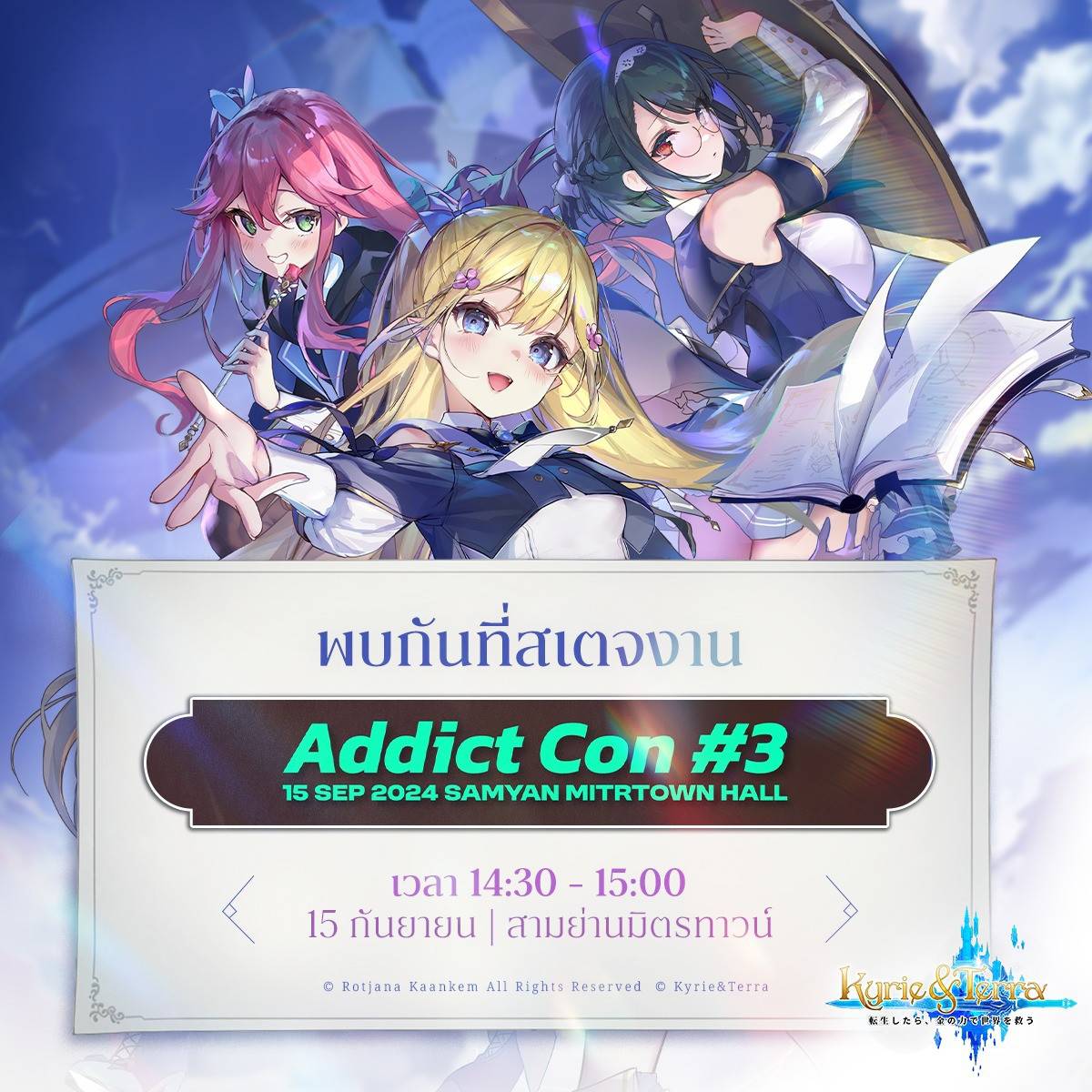 เตรียมตัวให้พร้อม และมาร่วมสนุกในหกรรมของคนรัก Pop Culture จัด ใหญ่ ให้สมกับครั้งที่ 3! ในงาน Addict Con #3 วันที่ 15 กันยายนนี้ ณ สามย่าน มิตรทาวน์ ฮอลล์ ชั้น 5 สามย่านมิตรทาวน์ ผู้ที่สนใจสามารถจับจองบัตรเข้างานได้ในราคา 150 บาทเท่านั้น สามารถซื้อได้ที่เคาท์เตอร์หน้างานและผ่านช่องทางออนไลน์ที่ https://www.ticketmelon.com/addictcon/adc3 สอบถามข้อมูลเพิ่มเติมเกี่ยวกับงานได้ทาง Facebook: https://www.facebook.com/AddictCon หรือ X (Twitter): https://x.com/AddictConEvent และ Facebook Group: https://www.facebook.com/groups/addictcon