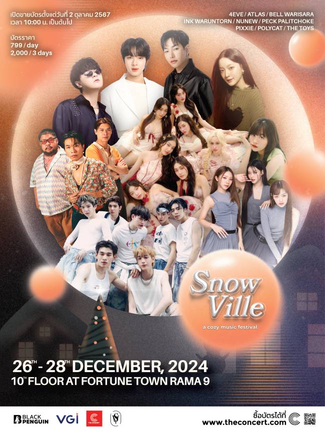 กลายเป็นงานเทศกาลดนตรีสุดเก๋ที่น่าจับมองไปซะแล้ว เมื่อบริษัท Black Penguin (แบล็ค เพนกวิน ) ผู้จัดคอนเสิร์ตที่คิดต่างและสร้างสรรค์ เปิดตัวเทศกาลดนตรีสุดว้าวชวนอบอุ่น "Snow Ville - a cozy music festival" ให้แฟนๆ เพลงและแฟนด้อม ได้ใกล้ชิดกับศิลปินคนโปรดในบรรยากาศหมู่บ้านหิมะที่ได้รับแรงบันดาลใจมาจากตลาดคริสต์มาสในยุโรป เทศกาลดนตรีในหมู่บ้านหิมะครั้งแรกกลางกรุงเทพ! ที่จะจัดขึ้นในวันที่ 26-28 ธันวาคม 2567 ณ ศูนย์การค้าฟอร์จูนทาวน์ ชั้น10 โดยขนทัพ 9 ศิลปินสุดฮอต ทั้งบอยกรุ๊ปและเกิร์ลกรุ๊ปแถวหน้าของเมืองไทย อย่าง 4EVE, PiXXiE, Bell Warisara, Ink Waruntorn, Nunew, The Toys, Polycat, ATLAS และ Peck Palitchoke