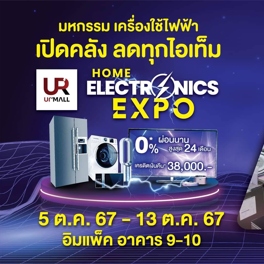 2. งาน Home Electronics Expo มหกรรมเครื่องใช้ไฟฟ้าเปิดคลัง ลดทุกไอเท็ม มาประชันราคากัน กว่า 20 แบรนด์ชั้นนำ จาก UR Mall รวบรวมเครื่องใช้ไฟฟ้าครบวงจร ที่มีตั้งแต่เครื่องใช้ไฟฟ้าชื้นเล็ก ไปจนถึงเครื่องใช้ไฟฟ้าชื้นใหญ่ อาทิ Samsung, Sony, Daikin, Electrolux, Beko และอื่น ๆ อีกหลายแบรนด์ โดยมาพร้อมกับโปรโมชั่น ลดสูงสุดถึง 80%, ผ่อนสบาย 0% นาน 24 เดือน , เครดิตเงินคืน 38,000 บาท จัดโปร ทั้งลด ทั้งแถม แจกเครดิตเงินคืน ส่งฟรี ติดตั้งฟรี