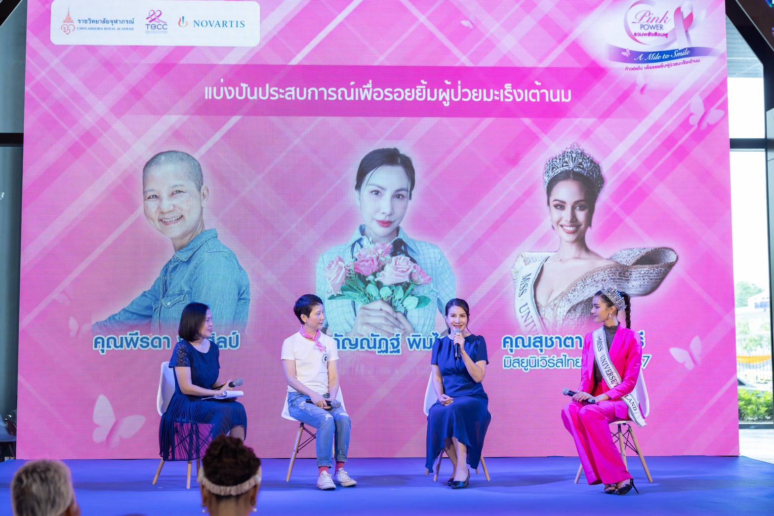 โดยมี คุณอรวรรณ โอวรารินท์ ประธานชมรมผู้ป่วยมะเร็งเต้านมแห่งประเทศไทย , คุณไอรีล ไตรสารศรี รองประธานชมรมผู้ป่วยมะเร็งเต้านมแห่งประเทศไทย , เภสัชกรหญิงสุมาลี คริสธานินทร์ ประธานบริหาร บริษัท โนวาร์ตีส (ประเทศไทย) จำกัด พร้อมด้วย คุณโอปอล-สุชาตา ช่วงศรี มิสยูนิเวิร์สไทยแลนด์ 2567 , คุณพีรดา พีรศิลป์ นักเขียนและบรรณาธิการอิสระกับชีวิตที่ต้องเผชิญกับมะเร็งเต้านมสู่จุดเปลี่ยนของชีวิตและการค้นพบความสุขที่แท้จริง , คุณกัญณัฏฐ์ พิมไธสง ตัวแทนผู้ป่วยมะเร็งเต้านมโรงพยาบาลจุฬาภรณ์ และ ดร.หทัยทิพย์ จิระธันห์ เป็นพิธีกรดำเนินรายการ เพื่อร่วมแบ่งปันประสบการณ์และส่งมอบกำลังใจเพื่อรอยยิ้มผู้ป่วยมะเร็งเต้านม ภายในงานยังได้รับเกียรติจากแขกรับเชิญพิเศษ คุณรัดเกล้า อามระดิษ ร่วมมอบบทเพลงเพื่อส่งกำลังใจให้ผู้ป่วยมะเร็งเต้านม โดยกิจกรรมครั้งนี้จัดขึ้น ณ ชั้น 1 อาคารโรงพยาบาลจุฬาภรณ์ ขนาด 400 เตียง เขตหลักสี่ กรุงเทพมหานคร