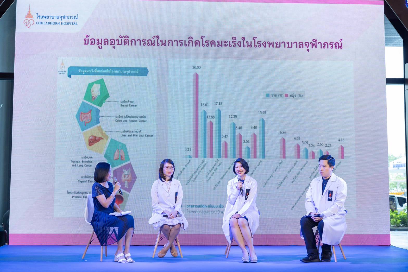 โดยมี ศาสตราจารย์เกียรติคุณ นายแพทย์รัชตะ รัชตะนาวิน รักษาการรองเลขาธิการราชวิทยาลัยจุฬาภรณ์ เป็นประธานเปิดงาน ร่วมด้วย รองศาสตราจารย์ นายแพทย์สุรศักดิ์ ลีลาอุดมลิปี ผู้อำนวยการโรงพยาบาลจุฬาภรณ์ นำทีมแพทย์สหสาขาด้านโรคมะเร็งของโรงพยาบาลจุฬาภรณ์ นำโดย แพทย์หญิงจอมธนา ศิริไพบูลย์ ผู้อำนวยการศูนย์มะเร็งวิทยา, ผู้ช่วยศาสตราจารย์ปฏิบัติการ แพทย์หญิงปิยะรัตน์ ลิมปวิทยากุล แพทย์เฉพาะทางอายุรศาสตร์มะเร็งวิทยา และนายแพทย์ธไนศวรรย์ ปลูกผล แพทย์เฉพาะทางศัลยศาสตร์มะเร็งวิทยา เสวนาให้ความรู้นวัตกรรมการตรวจวินิจฉัยและรักษาผู้ป่วยมะเร็งมะเร็งเต้านม และการร่วมผนึกสร้างพลังสีชมพูของกลุ่มผู้ป่วยมะเร็งเต้านมเพื่อสร้างรอยยิ้มให้กับผู้ป่วยมะเร็งเต้านม