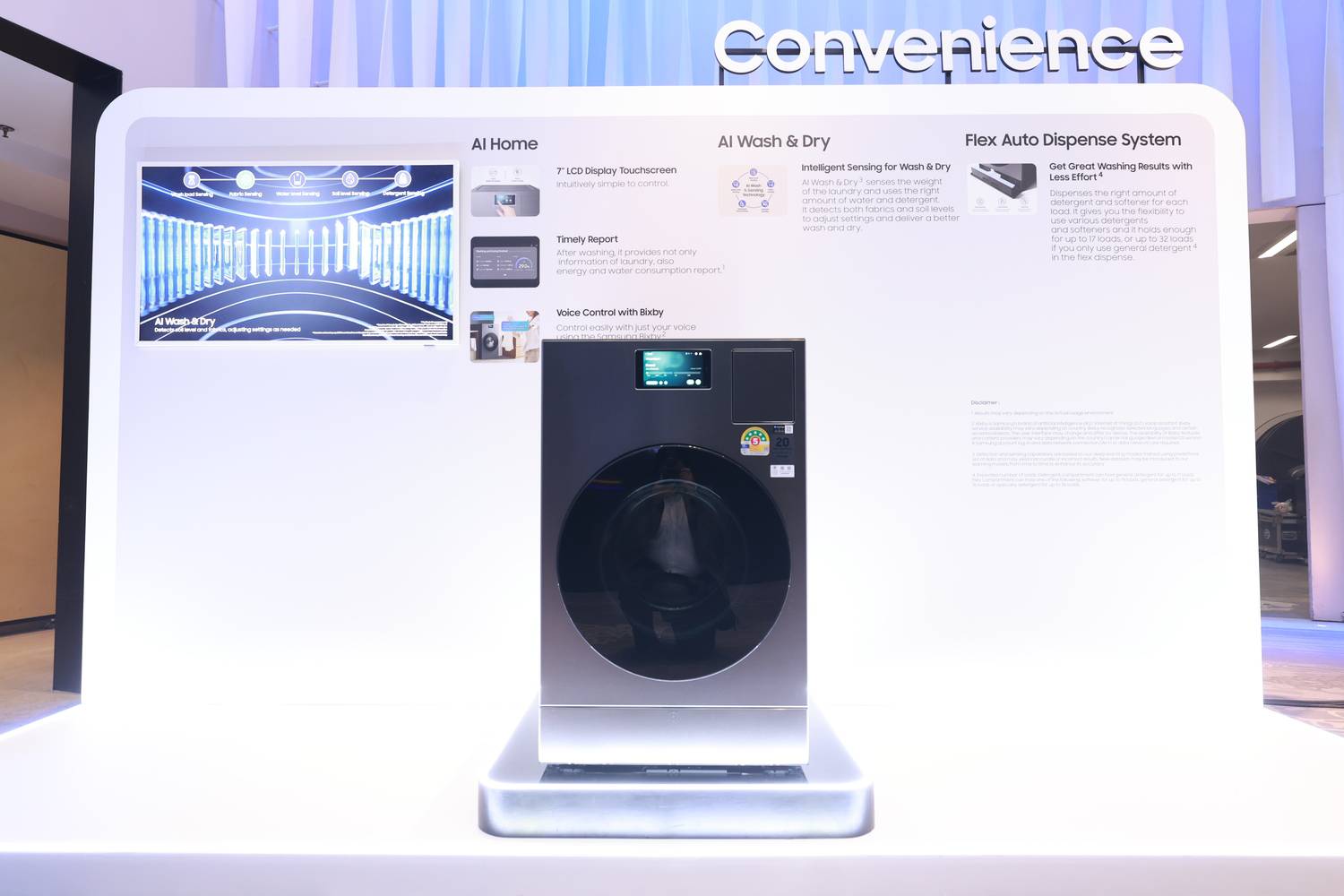 Bespoke AI Laundry ComboTM โดดเด่นด้วยเทคโนโลยี Heat pump ช่วยถนอมเนื้อผ้า พร้อมการซักและอบแห้งที่รวดเร็ว ประหยัดพลังงานในทุกขั้นตอนด้วย AI Wash & Dry เซนเซอร์อัจฉริยะที่ตรวจจับปริมาณผ้า ระดับน้ำ รวมถึงสภาพความสกปรก เพื่อปรับการซักให้เหมาะสม ช่วยประหยัดทั้งเวลาและพลังงานและสามารถซักและอบได้ในเวลาเพียง 98 นาที รองรับการซักผ้าขนาดใหญ่สูงสุดถึง 25 กิโลกรัมสามารถเชื่อมต่อกับแอปพลิเคชัน SmartThings เพื่อการควบคุมและจัดการอุปกรณ์ผ่านสมาร์ทโฟนได้ เพิ่มความสะดวกสบายให้กับผู้ใช้งานมากยิ่งขึ้น