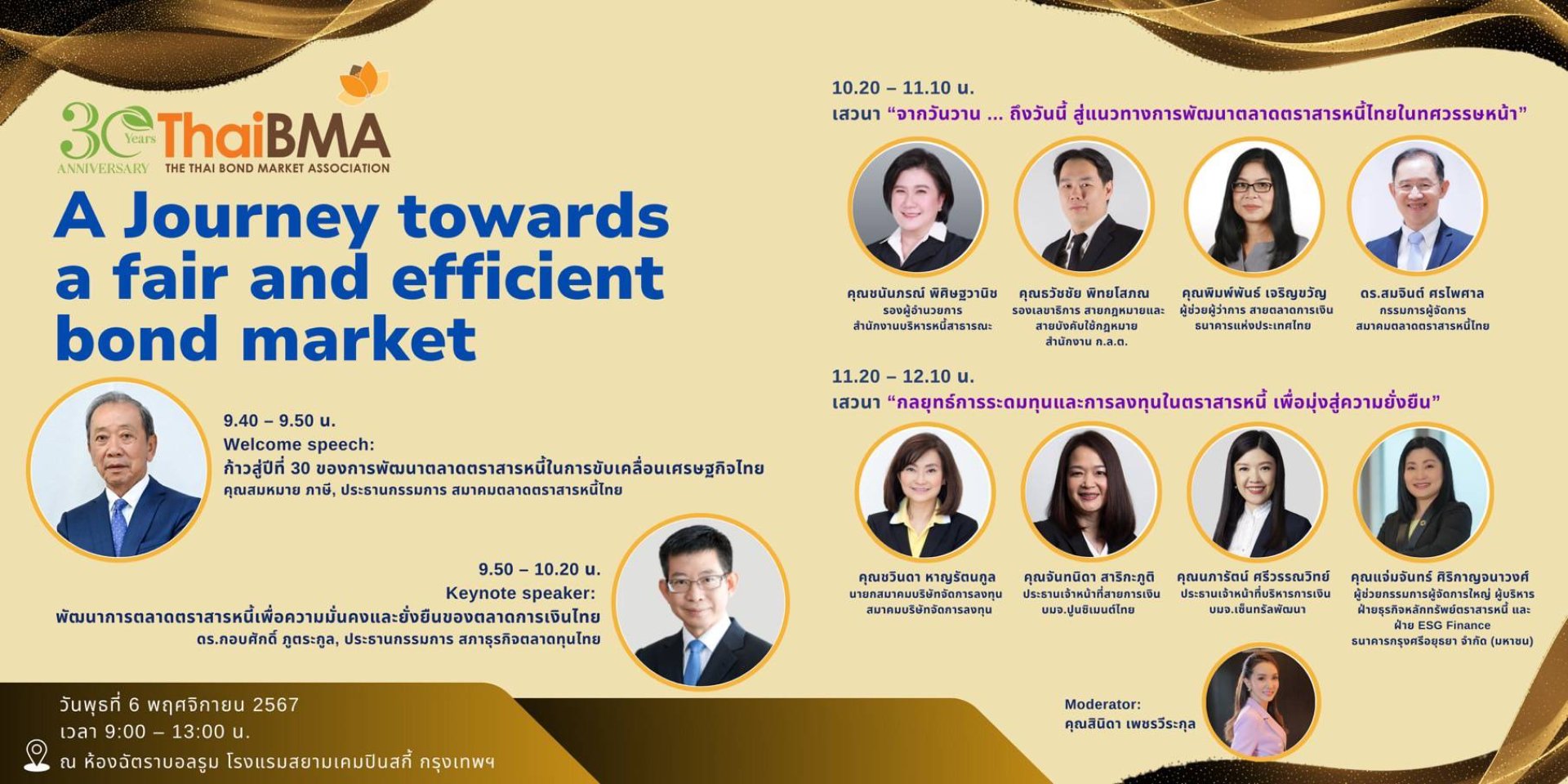 ทั้งนี้ ThaiBMA จะจัดให้มีงานสัมมนา "30 Years of ThaiBMA: A Journey Towards a Fair and Efficient Bond Market" ในวันพุธที่ 6 พฤศจิกายน 2567 เวลา 9:00 - 13:00 น. ณ โรงแรมสยามเคมปินสกี้ กรุงเทพฯ เพื่อแบ่งปันประสบการณ์การมีส่วนร่วมในการพัฒนาตลาดตราสารหนี้ที่ผ่านมา และนโยบายแนวทางการพัฒนาตลาดตราสารหนี้ไทยในระยะข้างหน้า พร้อมจัดทำหนังสืออนุสรณ์บันทึกที่มาเส้นทางความสำเร็จของการพัฒนาตลาดตราสารหนี้ไทยที่จะนำออกเผยแพร่ต่อไป